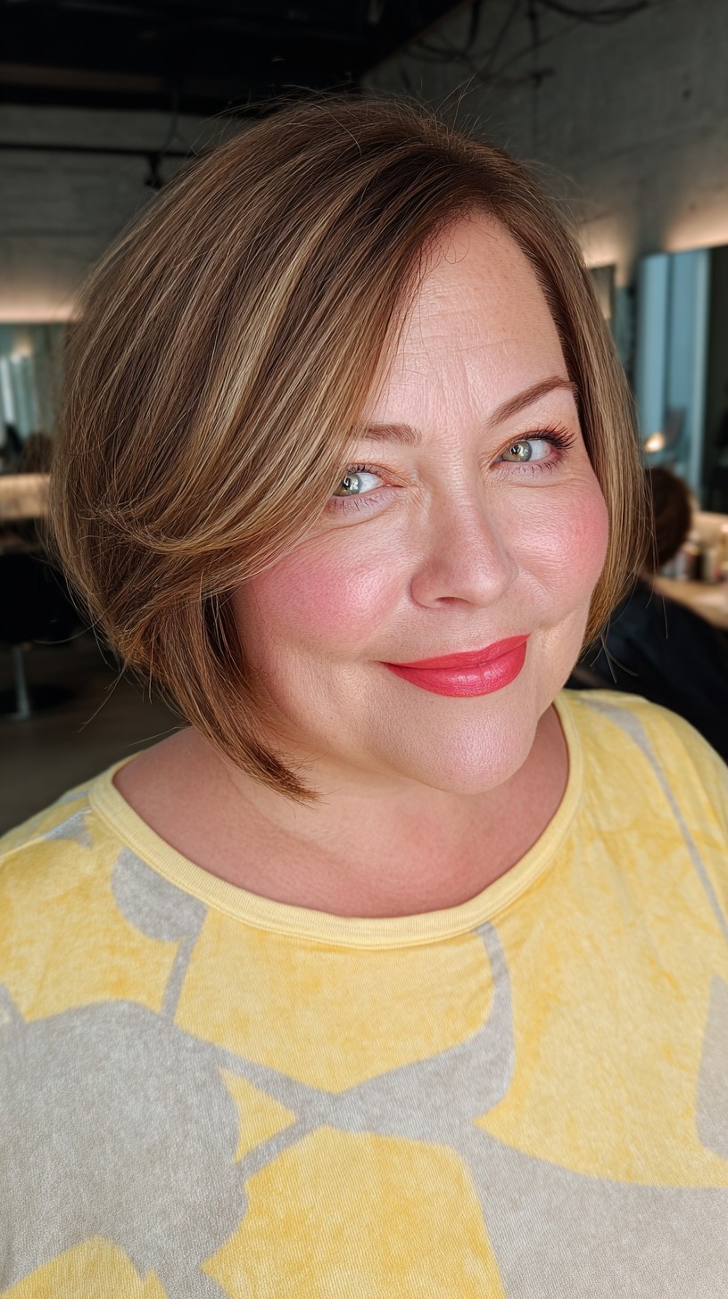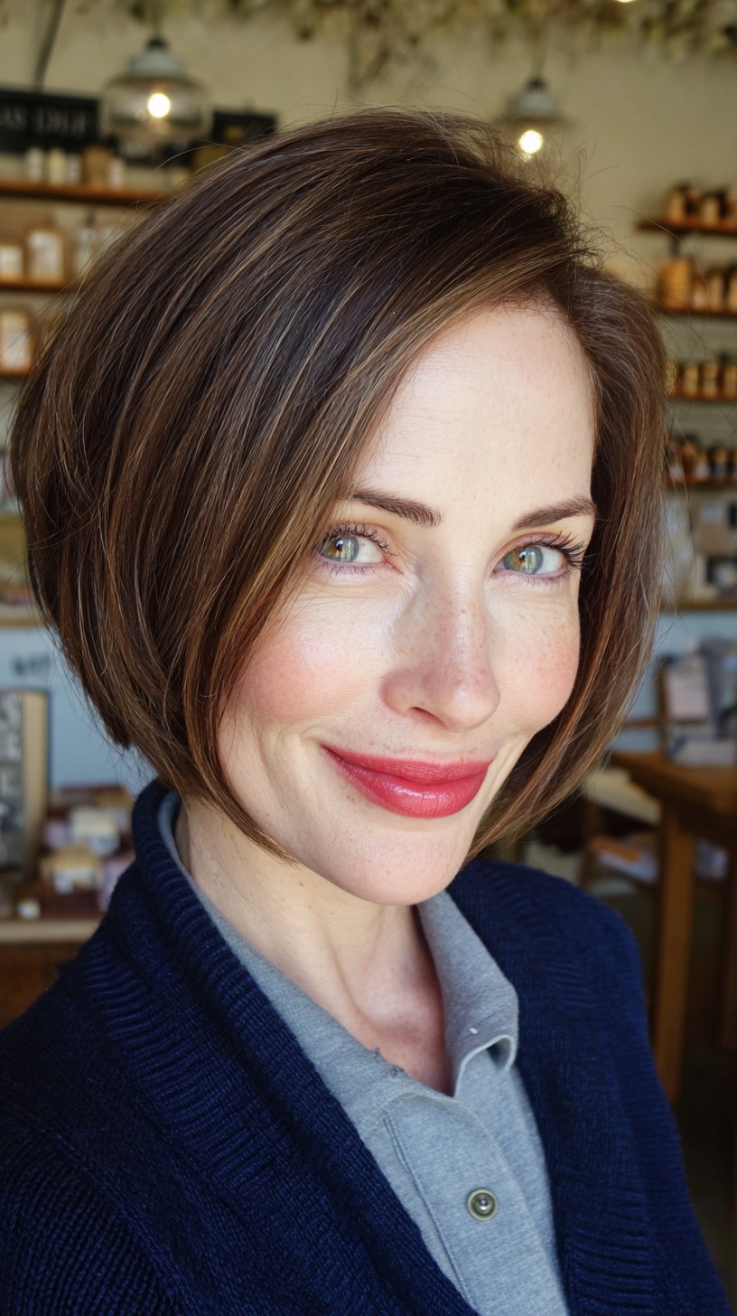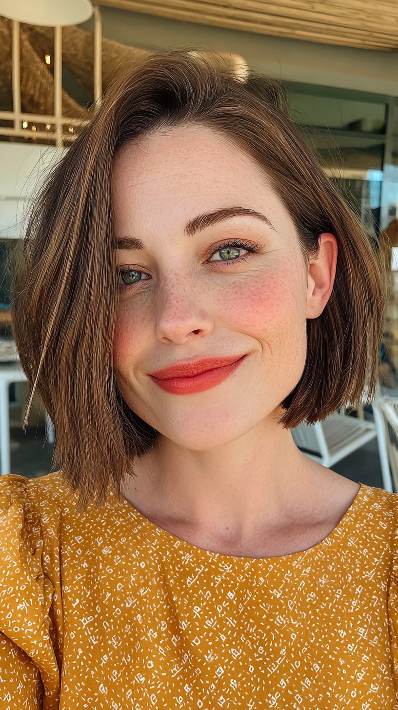 For anyone seeking a fresh, streamlined look that frames the face beautifully, consider this sleek chestnut bob. It features an asymmetrical cut, which adds a modern twist and helps accentuate the jawline. This style works well for straight, medium-density hair and is particularly flattering for oval face shapes. While this cut offers ease of maintenance, the precision required means regular salon visits are necessary to keep the lines sharp. Ideal for someone looking to project professionalism without excessive daily styling.