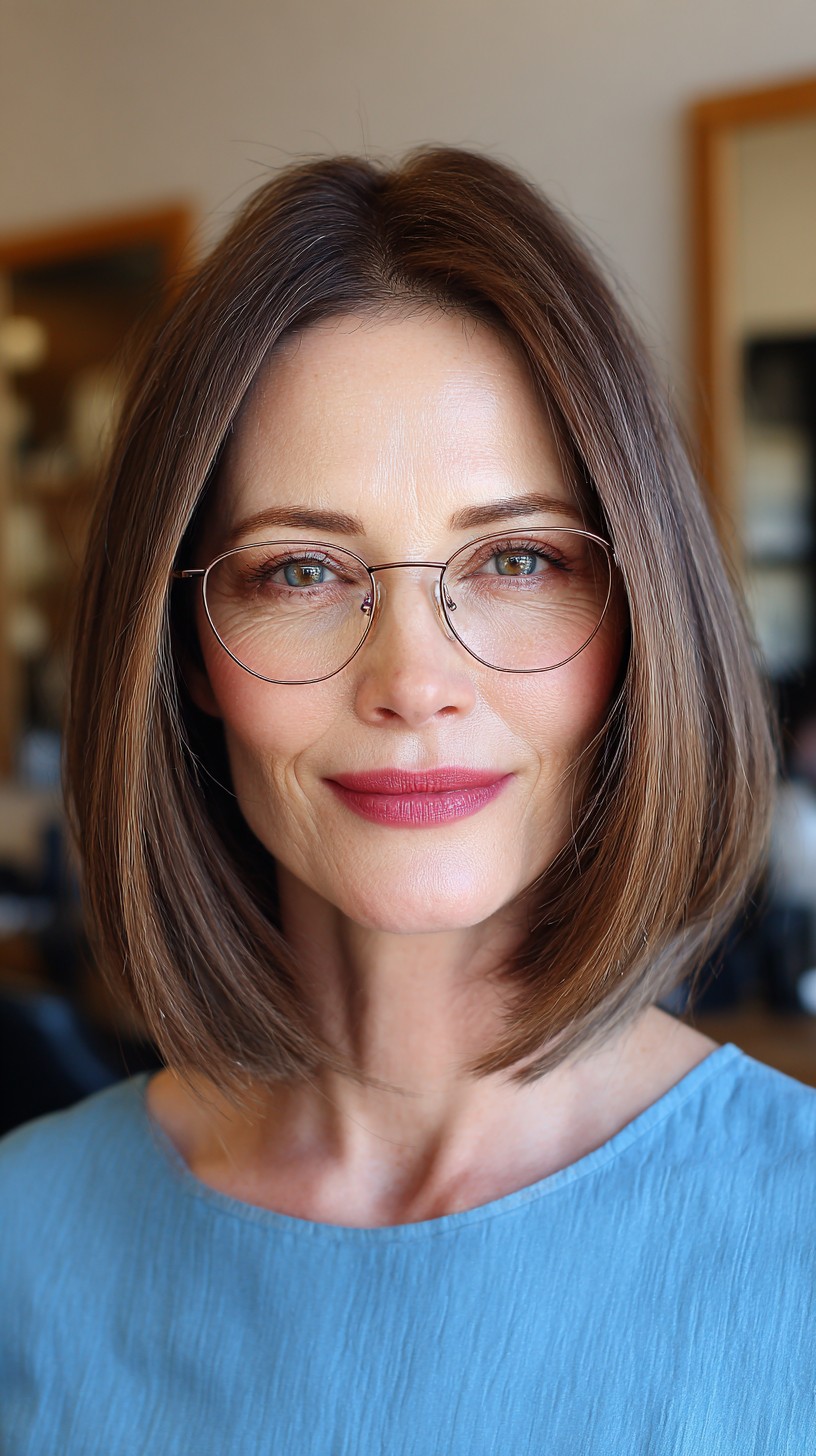 This medium brown bob features a sleek finish with subtle layers that enhance movement and texture. The hair length falls just above the shoulders, making it versatile for various face shapes, particularly oval and heart-shaped. Ideal for fine to medium hair types, this cut offers a polished look with minimal styling effort. Consider using a smoothing serum for added shine. The straightened style highlights the rich color and adds an elegant touch, perfect for both casual and formal occasions.
