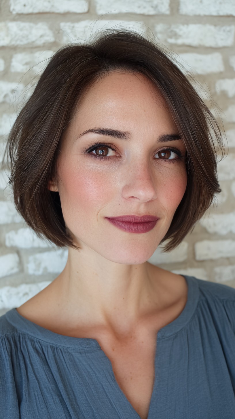 This chic brunette bob is tailored to complement an oval or heart-shaped face, showcasing soft, textured layers that add volume and movement, ideal for someone with medium to thick hair density. The subtle feathering around the face gently frames the cheeks, enhancing your natural facial structure without overpowering subtle features. This cut is versatile and easy to maintain, though shorter styles like this will require frequent trims to keep the style looking sharp. This look is not only trendy but timeless, making it a safe yet fashionable choice for those looking to update their hairstyle without committing to an extreme change.