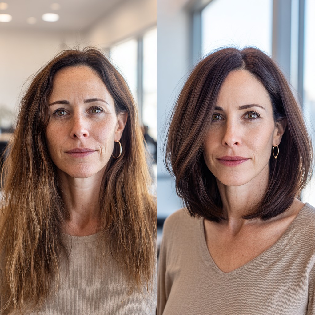 Before the cut, the hair appears fine and somewhat lifeless, a common concern as we age. Post-cut, the textured layers add considerable volume and frame the face beautifully, ideal for elongated face shapes. A rich chocolate hue adds depth and an illusion of thickness, which is a smart choice for thinning hair. While fabulous, layers require regular shaping to maintain the lush, full look. This style refreshes the face, making it a fantastic option for those looking to rejuvenate their appearance with a simple yet impactful change.