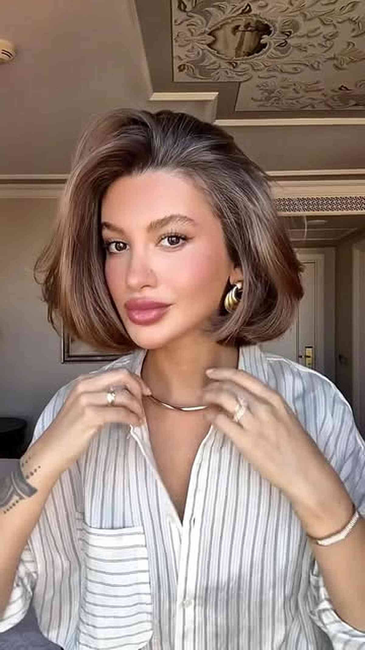 This soft brunette layered bob is perfect for adding volume and movement. The layers are expertly cut to frame the face, making it ideal for oval and heart-shaped faces. With a medium length that sits just below the chin, this style works well for fine to medium hair density. The subtle highlights enhance the dimensional look, while a light styling cream can maintain the soft texture. Consider this cut if you’re looking for a chic, low-maintenance hairstyle that still feels fresh and modern.