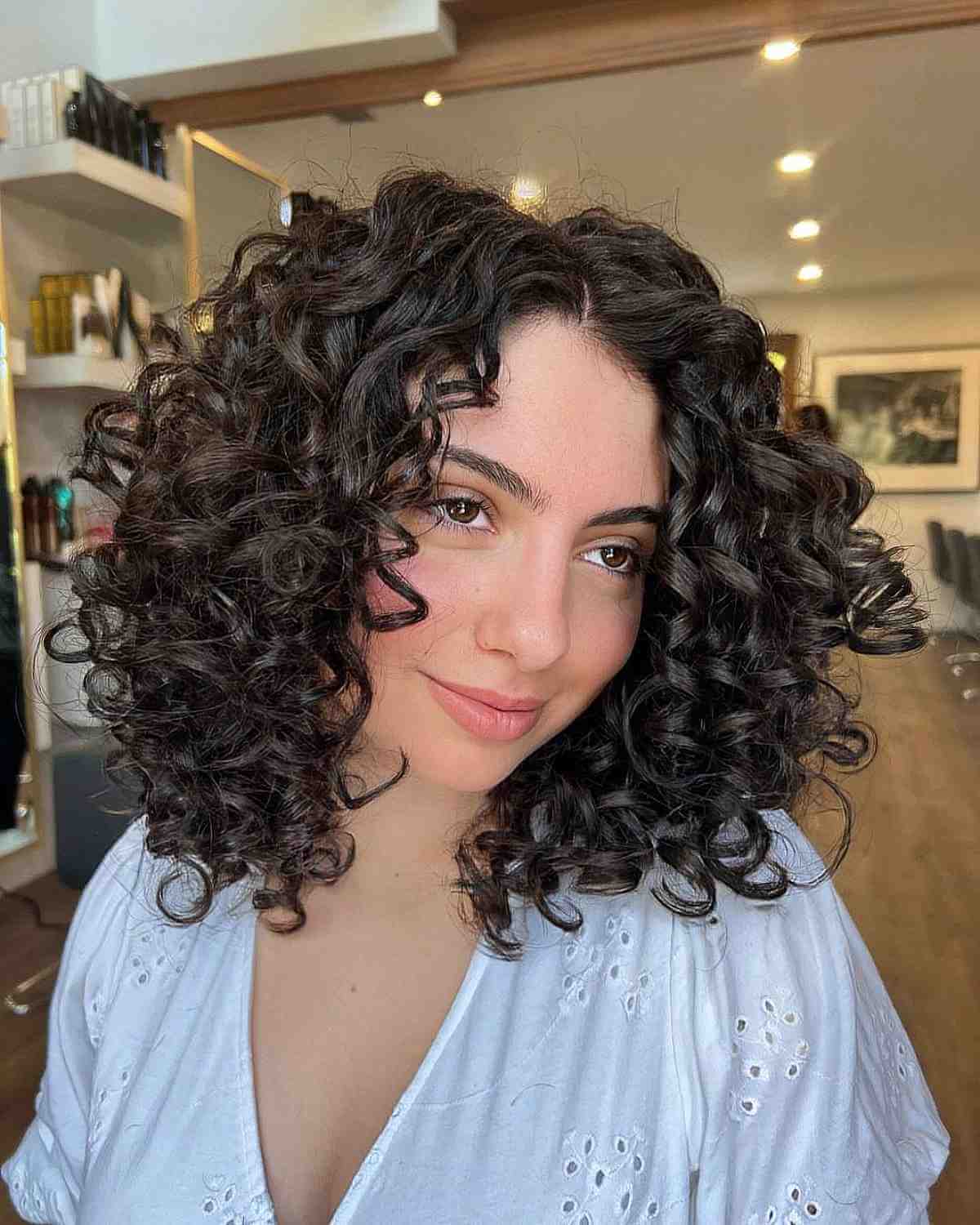 A complete head of beautiful curls appears stunning in a length that’s slightly beyond the chin. Featuring layered curly hair will offer essential volume and definition when paired with the appropriate curling products.