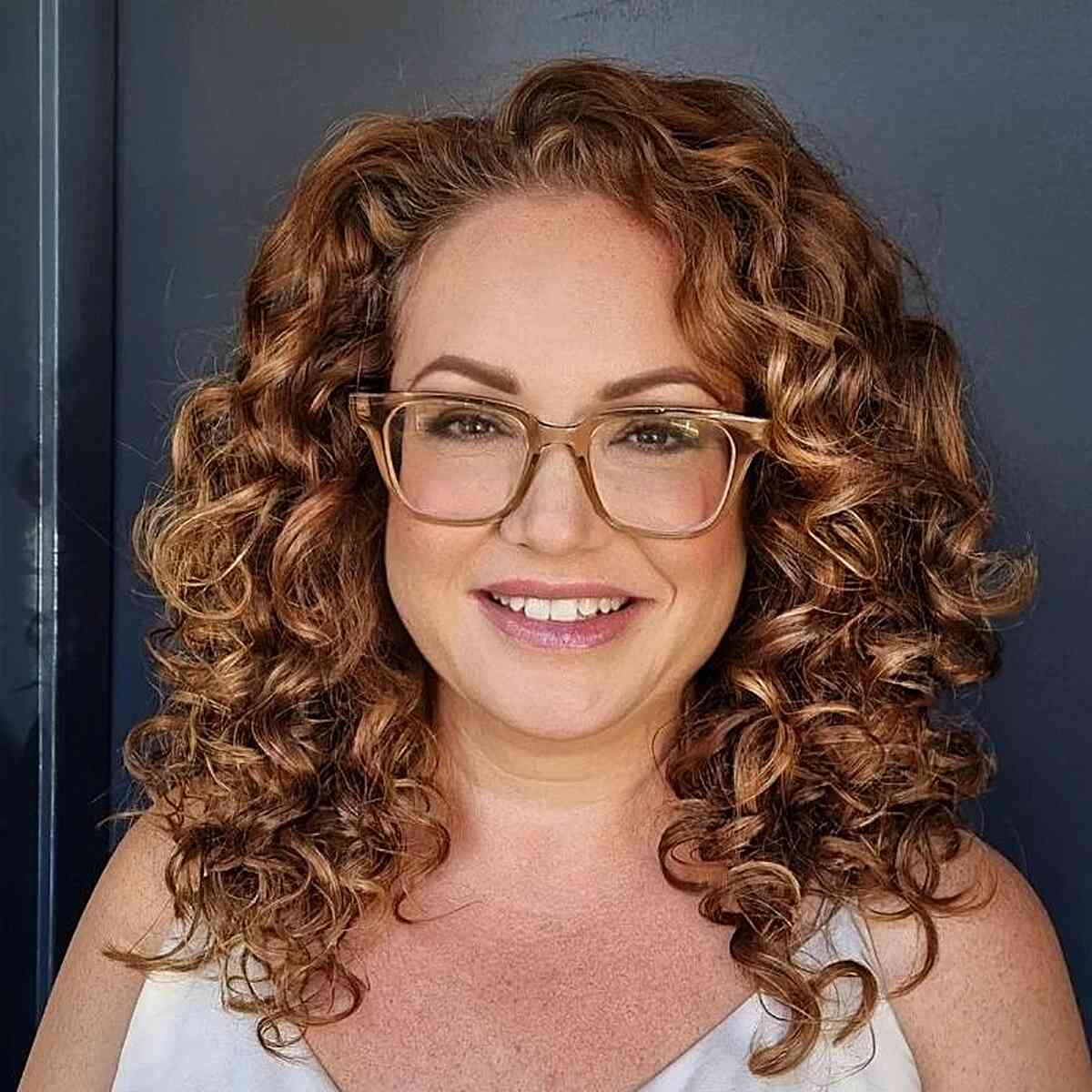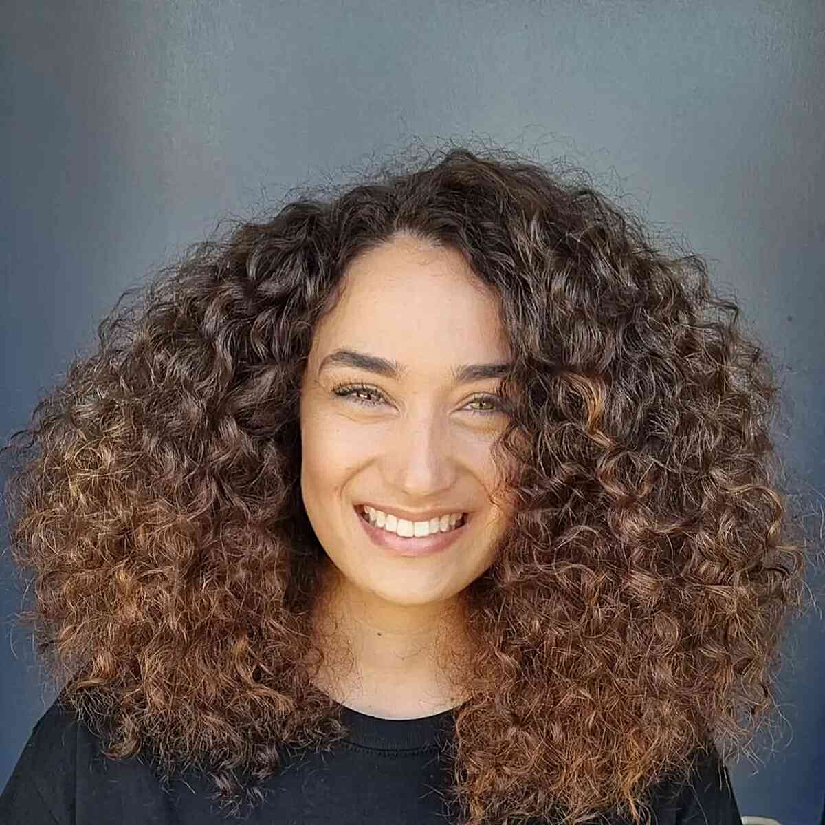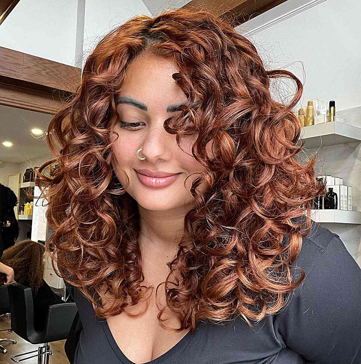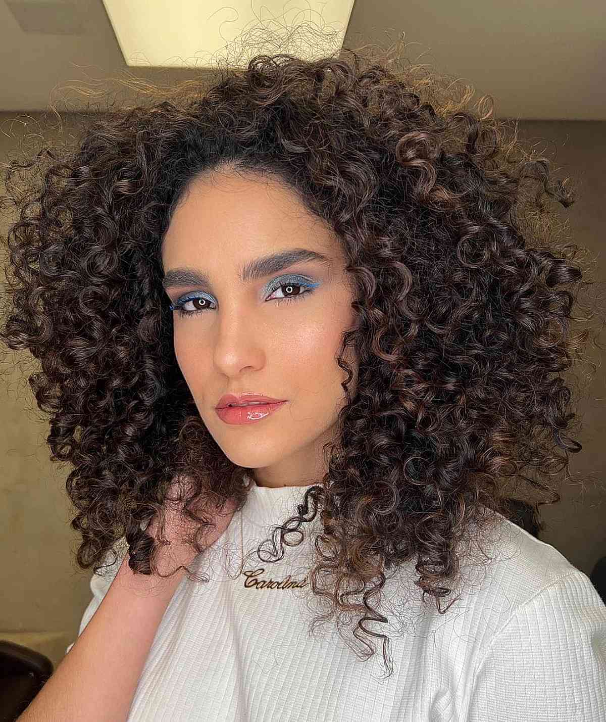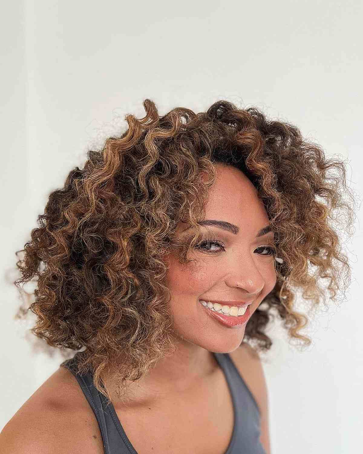 These chic layered medium-length curls aren’t just stylish. The layers for curly hair are perfect for women with thick hair and a broader face shape. It’s the cut that helps the tresses look less bulky and feel a bit lighter. Natural curls and a golden hue create an ideal combination for this hairstyle.