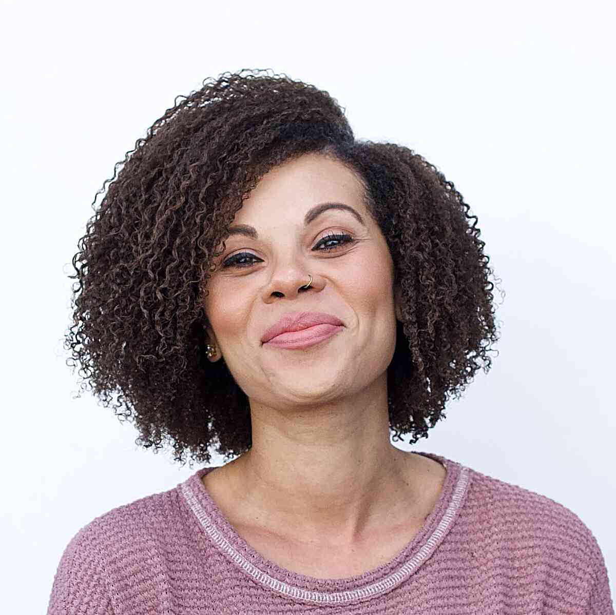 One of the most popular styles for textured hair is beautiful dark curls without bangs. This healthy, moisturized hairdo will have heads turning everywhere you go. To keep your mane this glowy, avoid products with too much alcohol and reach for ones with conditioning ingredients like coconut oil, murumuru butter, and shea.