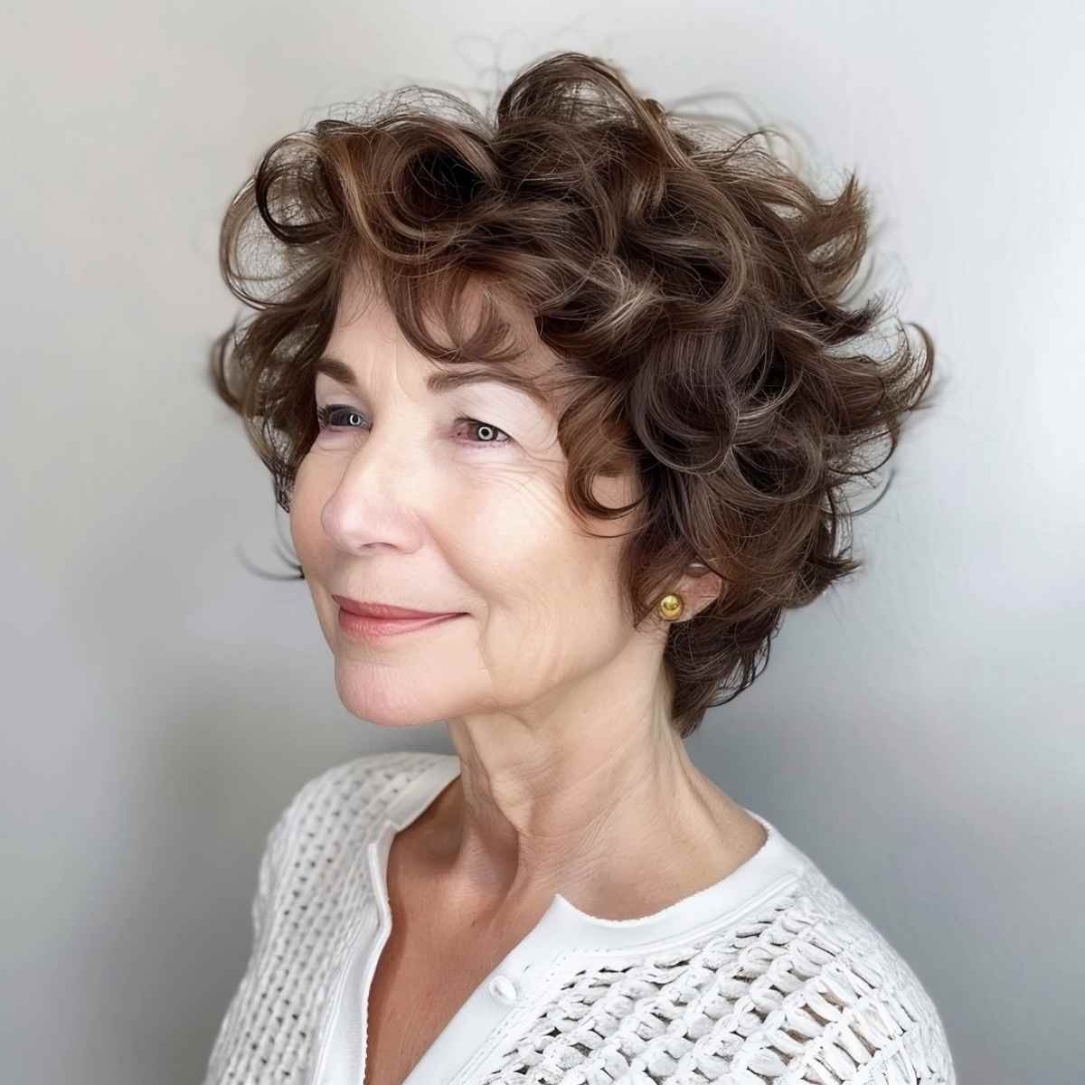 A fresh short layered haircut is a fantastic way to enhance your natural curls. Having a neck-length cut is a beneficial way to add body and volume without having too much bulk. Layered hair and curls work beautifully together for creating stunning hairstyles. And they look especially lovely on older women.