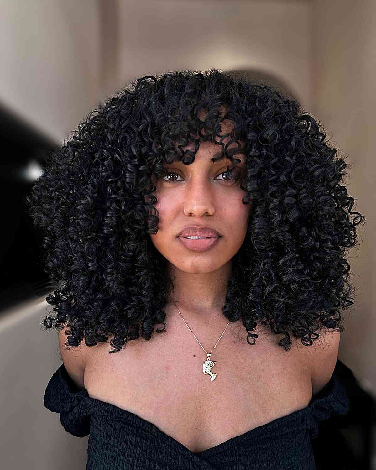 This hairstyle showcases natural, loose curls with layered framing and delicate, wispy bangs. The layers enhance the curl’s natural shape and minimize bulk, allowing the hair to look lighter and more voluminous. This cut is ideal for individuals with medium to thick curly hair and is particularly flattering for those with an oval or heart-shaped face. For styling, apply a curl cream on damp hair and let it air dry to achieve these soft, defined curls with minimal frizz.