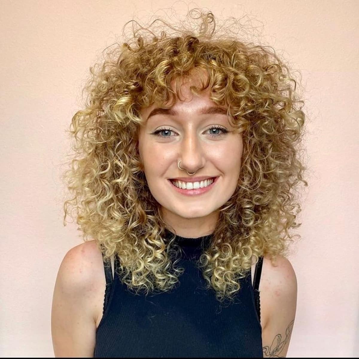 Layered curtain bangs will refresh your curly hairstyle. You should have your stylist add medium-length rounded layers. You’ll adore the volume this will create! When trying the curtain bang, make sure the lengths are kept longer to accommodate shrinkage. Then, enjoy the gentle tendrils framing your face. I recommend using a diffuser for optimal volume, and don’t forget your curl products.