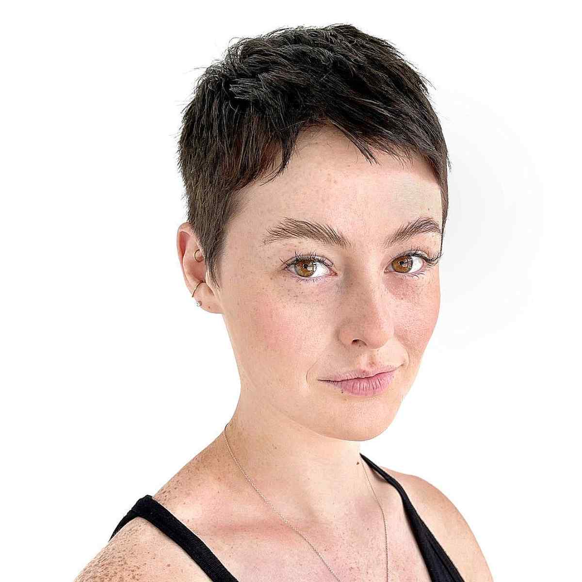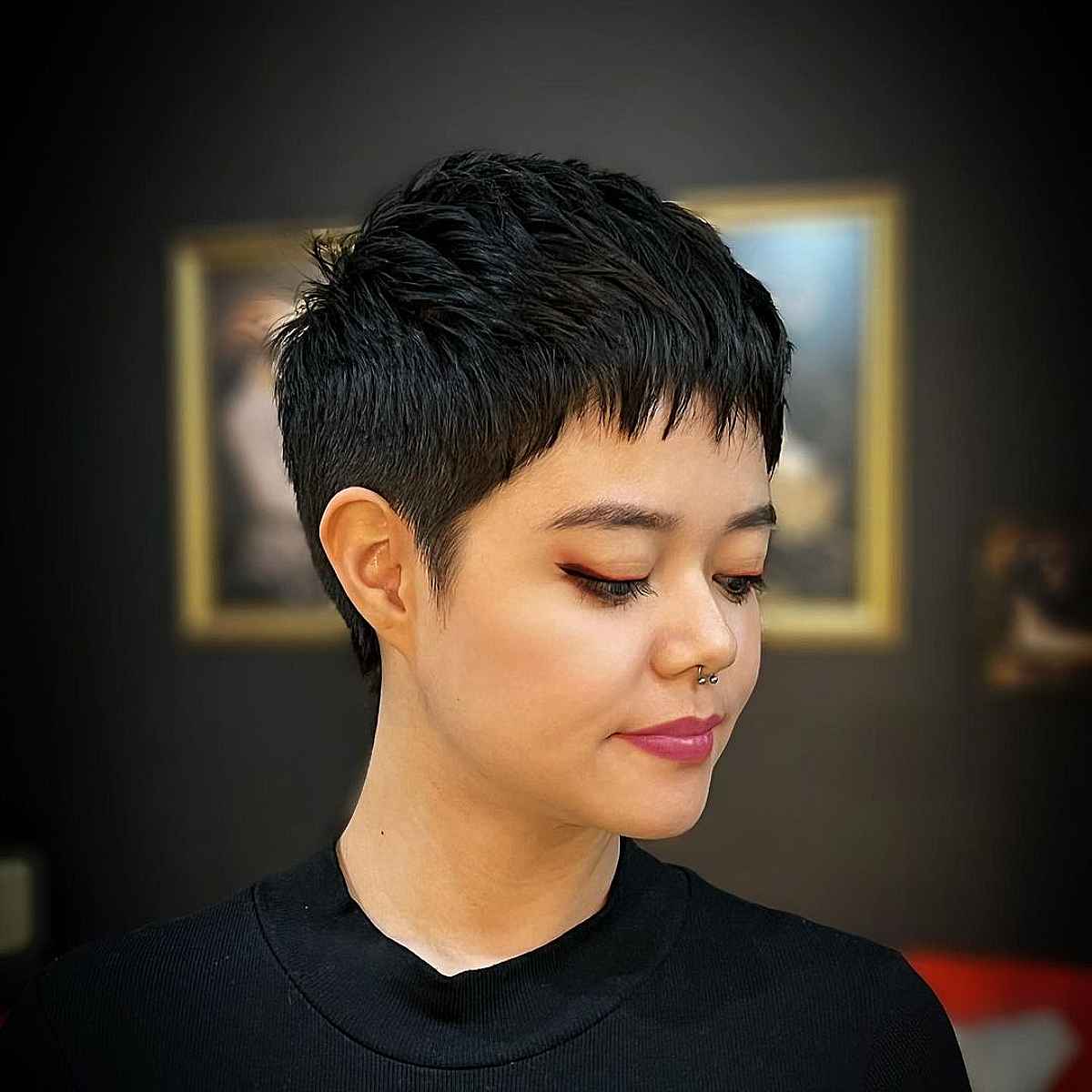 One of the most striking ultra-short hairstyles is the androgynous pixie with fringe. This exceptionally flattering, textured cut will definitely attract attention with its deep black hue and intricate fringe.