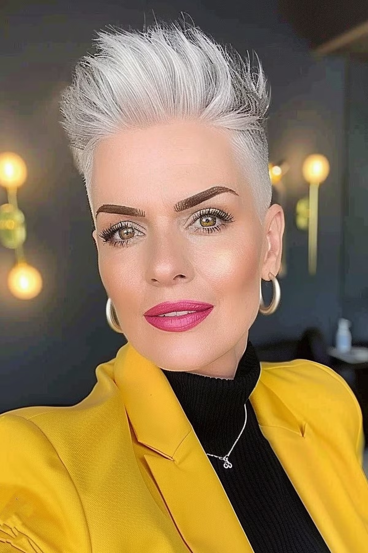 Discover this chic buzz cut for silver hair! This style enhances your individuality with an edgy yet graceful appearance. Your stylist can achieve this look with a razor or scissors, depending on your preference. For added flair, incorporate matte clay into your styling routine. It will provide your short hair with a textured finish and noticeable volume.