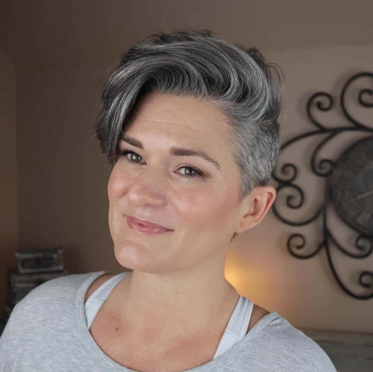 If you appreciate a blend of bold and delicate, then consider a short edgy pixie. Because a shorter haircut reveals more of the face, be sure to consult with your stylist to maintain length and texture in your areas of concern when opting for an on-trend silvery gray hair pixie.