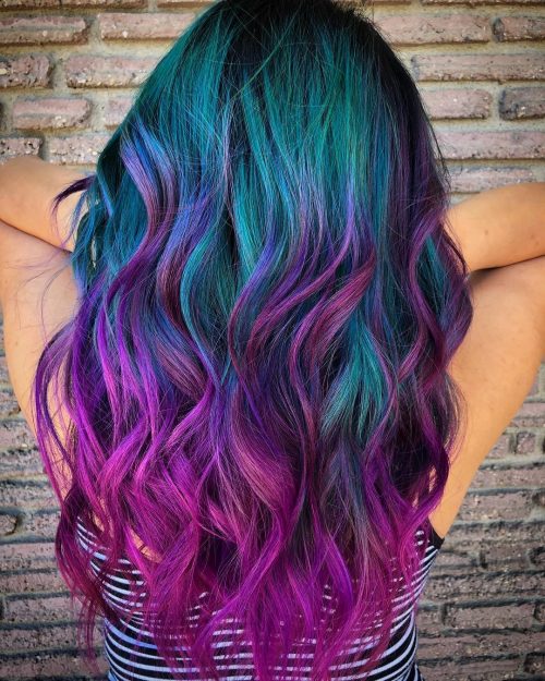 Starting with natural dark roots can reduce your trips to the salon so that you can maintain this enchanting shade of teal and magenta for an extended period.