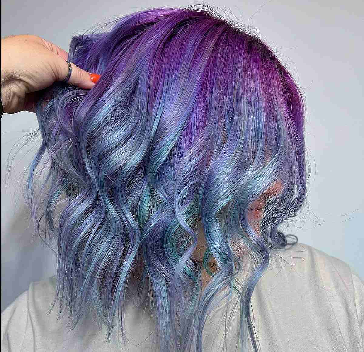 Any hair length can embrace this enchanting galaxy color melt of purple, teal, and magenta.