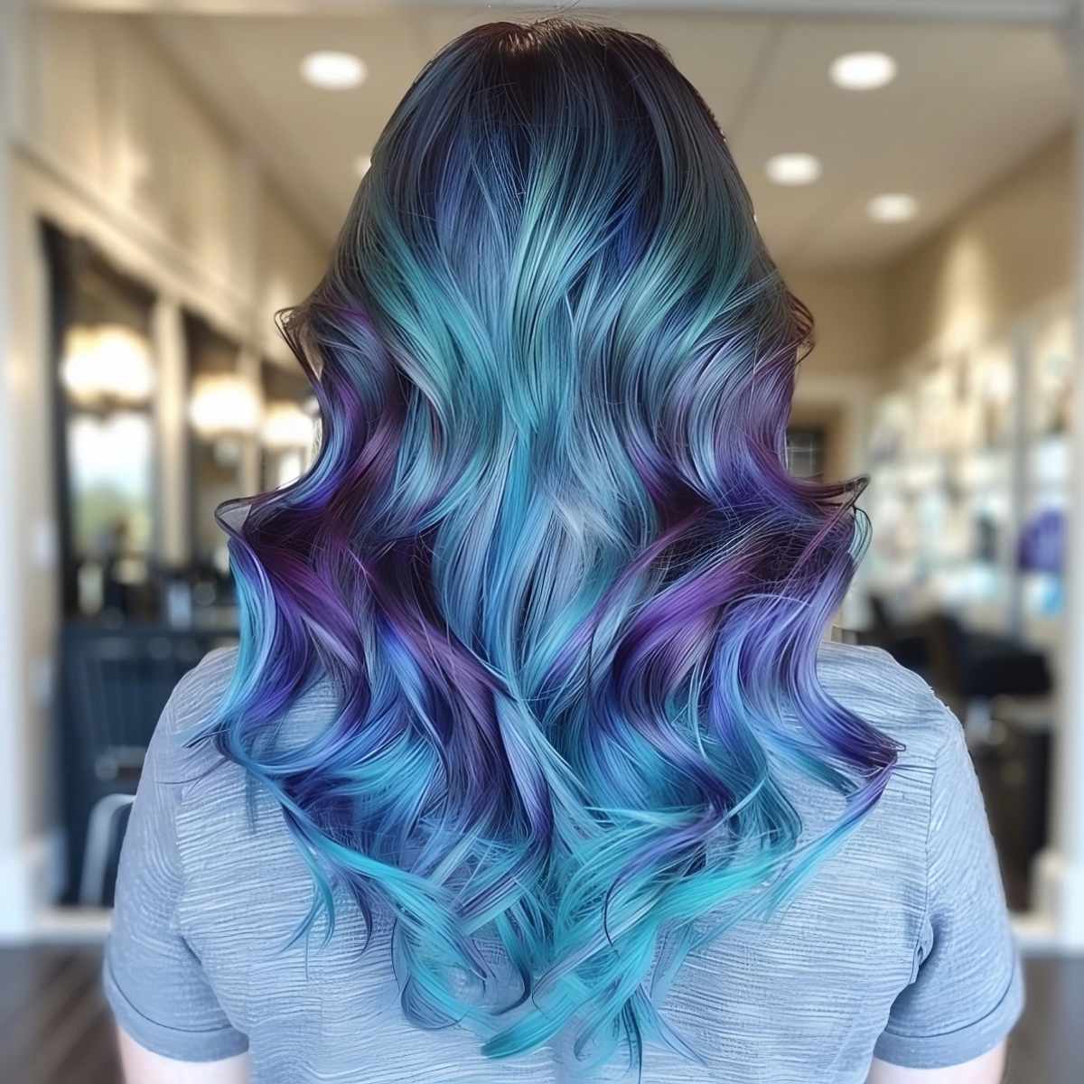 This bold and rich galaxy balayage hairstyle is genuinely eye-catching, featuring vibrant hues that complement fair skin tones. The aqua blue starts at the roots and fades into a bright teal, with purple acting as a transition shade.