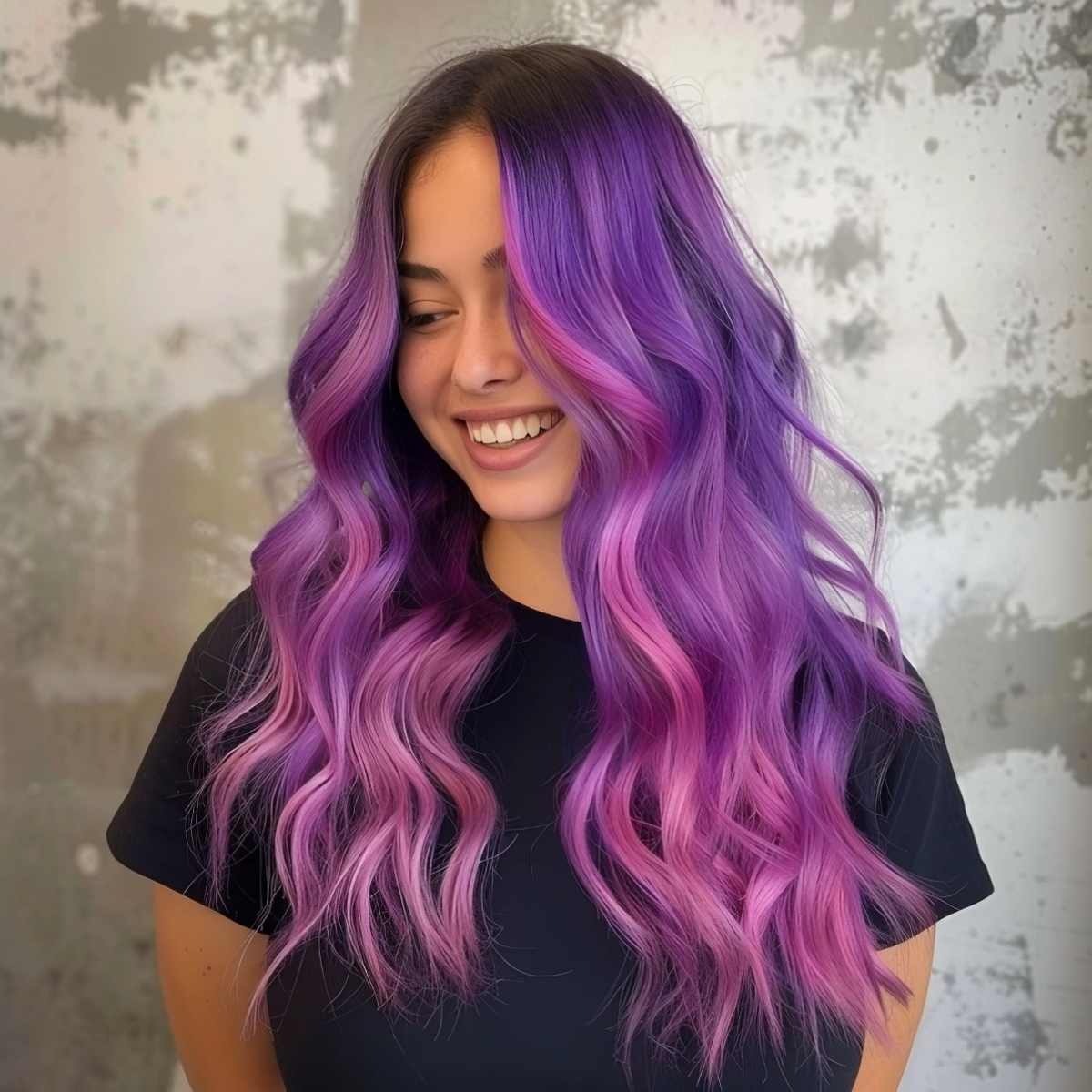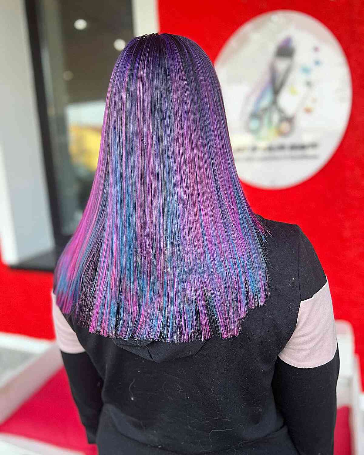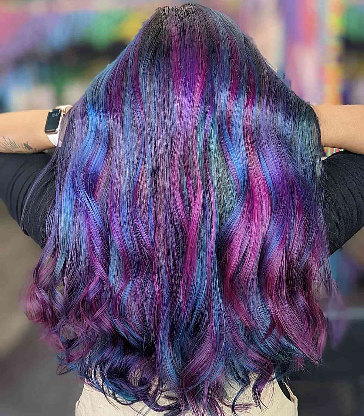Experiment with vibrant fuchsia and turquoise blue highlights for a playful, galaxy-inspired style! These bold colors create a striking contrast, adding dynamic depth that blends beautifully. Plan to visit the salon approximately every month to maintain the freshness of the purple and blue hues.