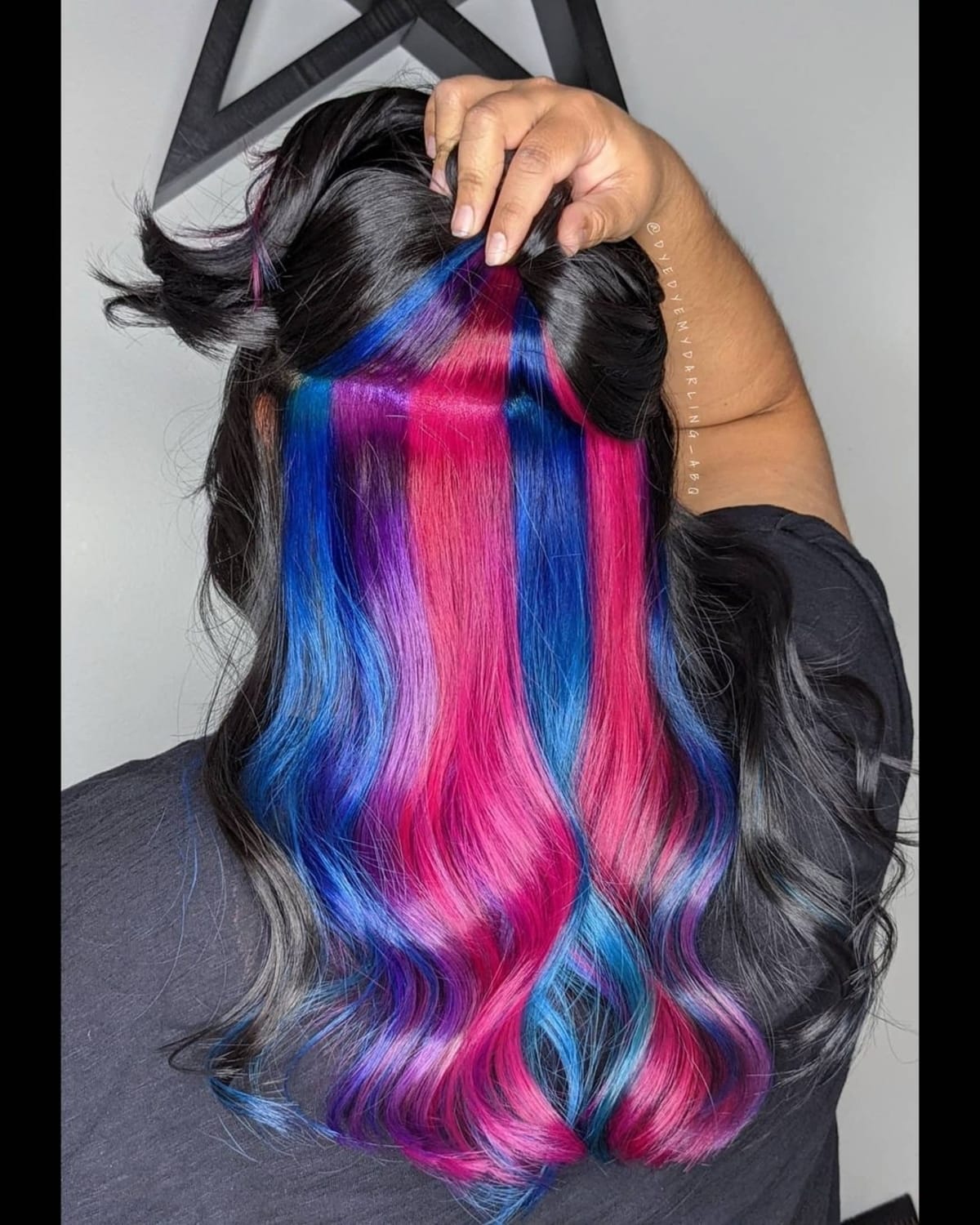 Transform your hair with these vibrant galaxy-inspired shades of purple, blue, and hot pink if you’re looking for an exciting alternative to plain black hair.