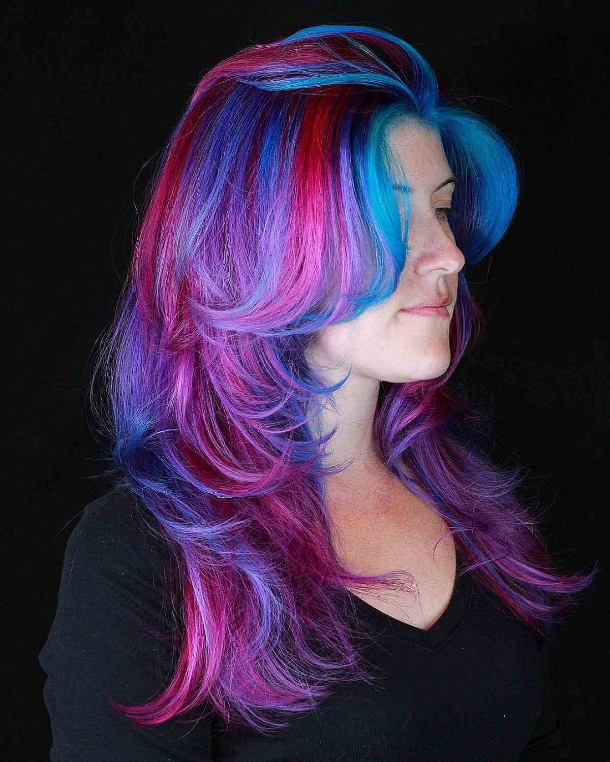 A butterfly haircut is a 70’s hairstyle with a contemporary twist of bright colors distributed throughout. Using 3-4 colors in the same color family or tonal range might be ideal. Your hair colorist should mention that such galaxy hair designs will require regular upkeep. Expect to lighten your roots every 6-8 weeks. Bright colors, being semi-permanent, do fade a bit quicker than permanent hair color. Make sure only to shampoo your hair 1-2x per week to prevent your hair color from fading too quickly.
