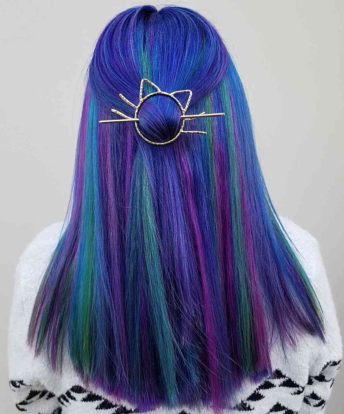 Subtle galaxy-inspired highlights are created by lightening the hair and incorporating shades of blue, pink, and purple to achieve a vibrant color palette. Request your stylist to position them on the mid to lower back of your head for a peek-a-boo effect.