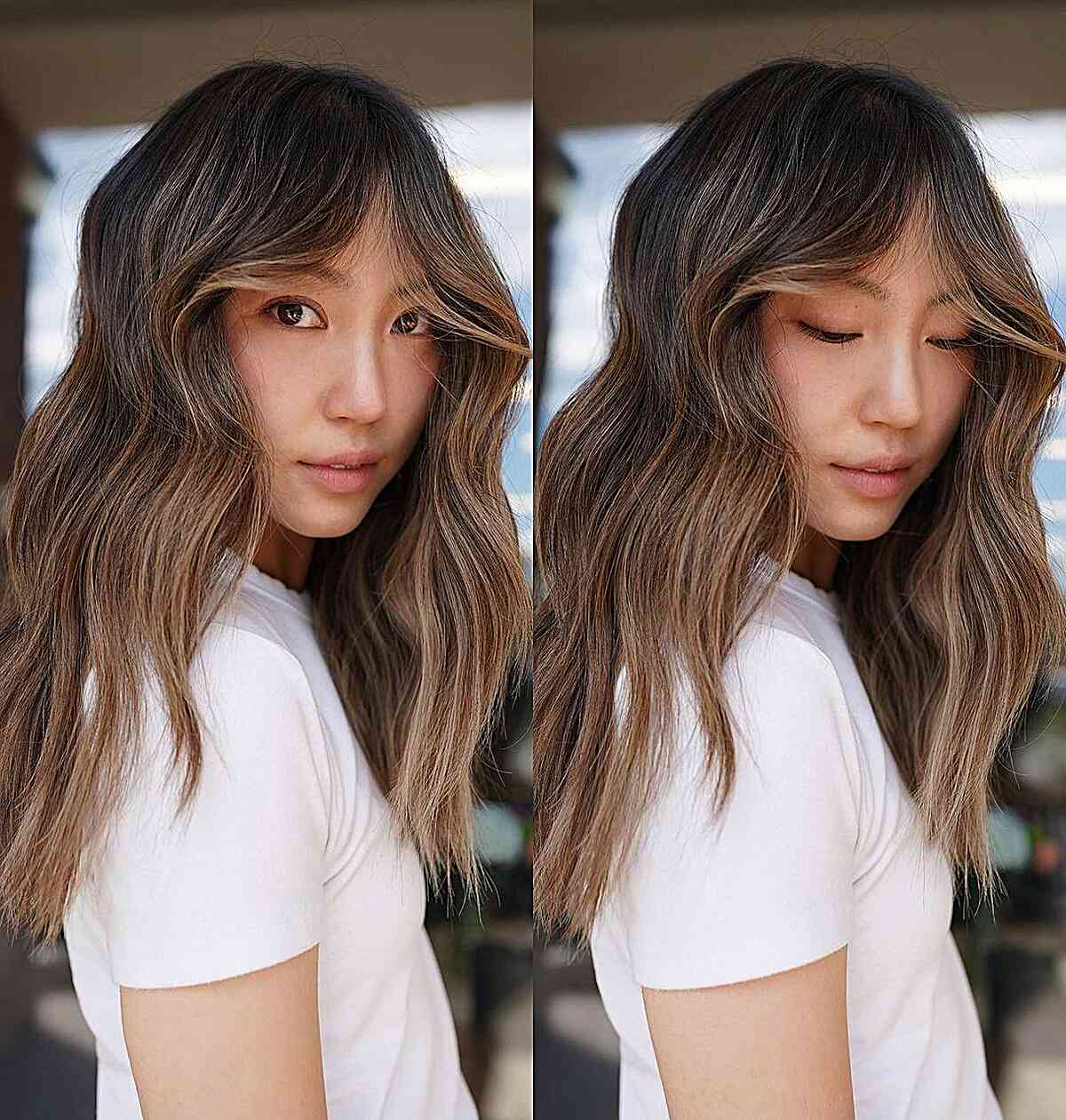 For a maintenance-friendly style, request your stylist to lift the balayaged highlights around your face while incorporating a halo effect for the sides and back. Opt for a caramel shade that complements both your skin tone and natural hair color. The beautifully blended balayaged highlights and lows enhance your complexion. It’s essential to maintain an authentic look, so focus on shades that naturally suit you. Keep it uncomplicated.