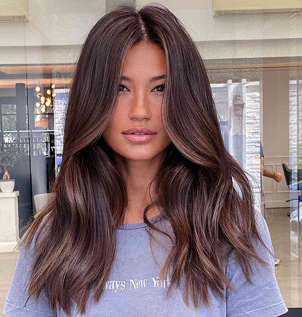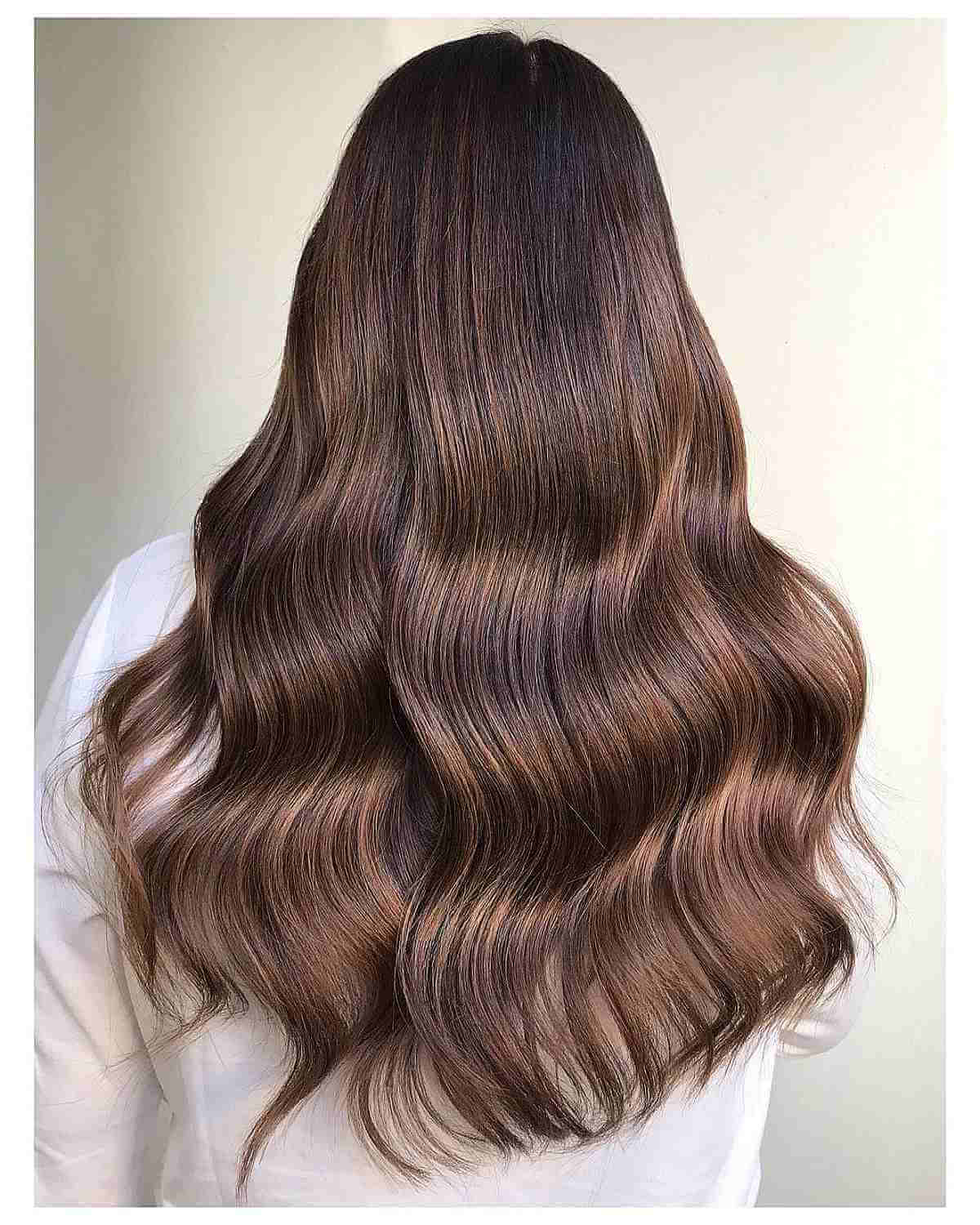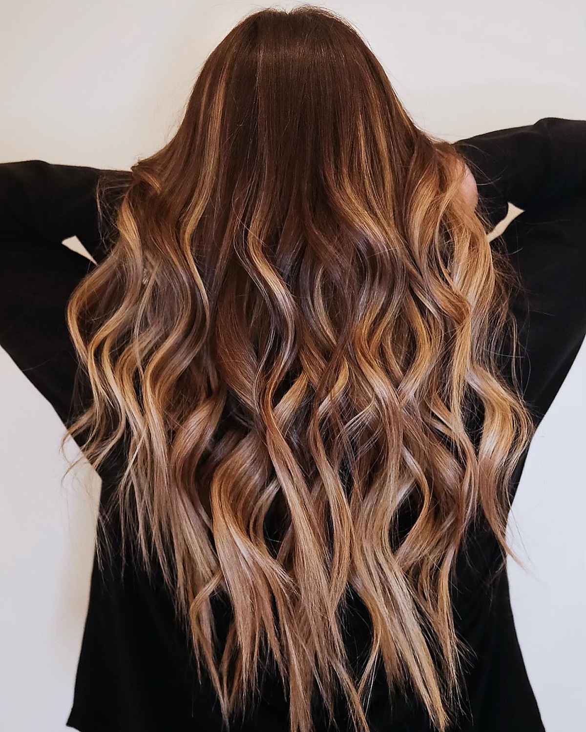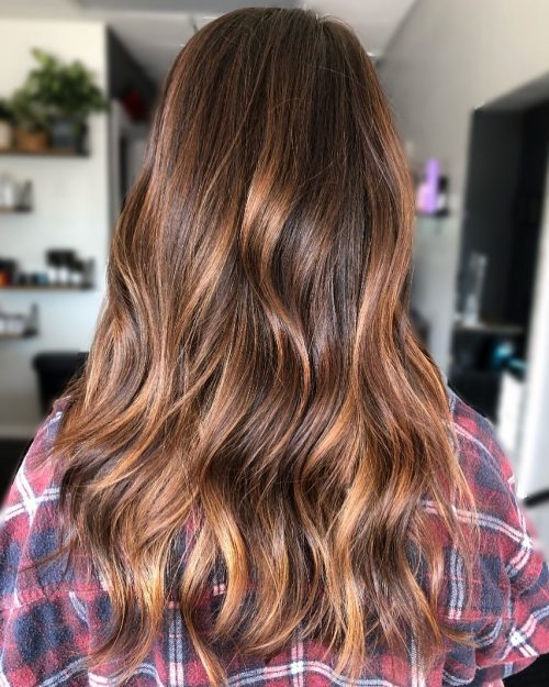 You can’t go wrong with stunning long dark caramel hair with waves. Chocolate and caramel balayage colors are blended in this hair color inspiration, creating a luxurious and gorgeous effect.