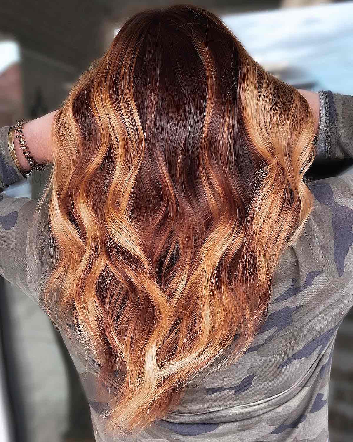 Go for a color melt that’s reminiscent of warm caramel apple cider. I love the depth and dimension in this copper and golden caramel balayage. Hand-painting a few pieces of caramel adds a touch of radiance to your hair without removing your gorgeous base color. Ask your stylist to stick with caramel or caramel with a hint of red. You want the colors to harmonize beautifully.