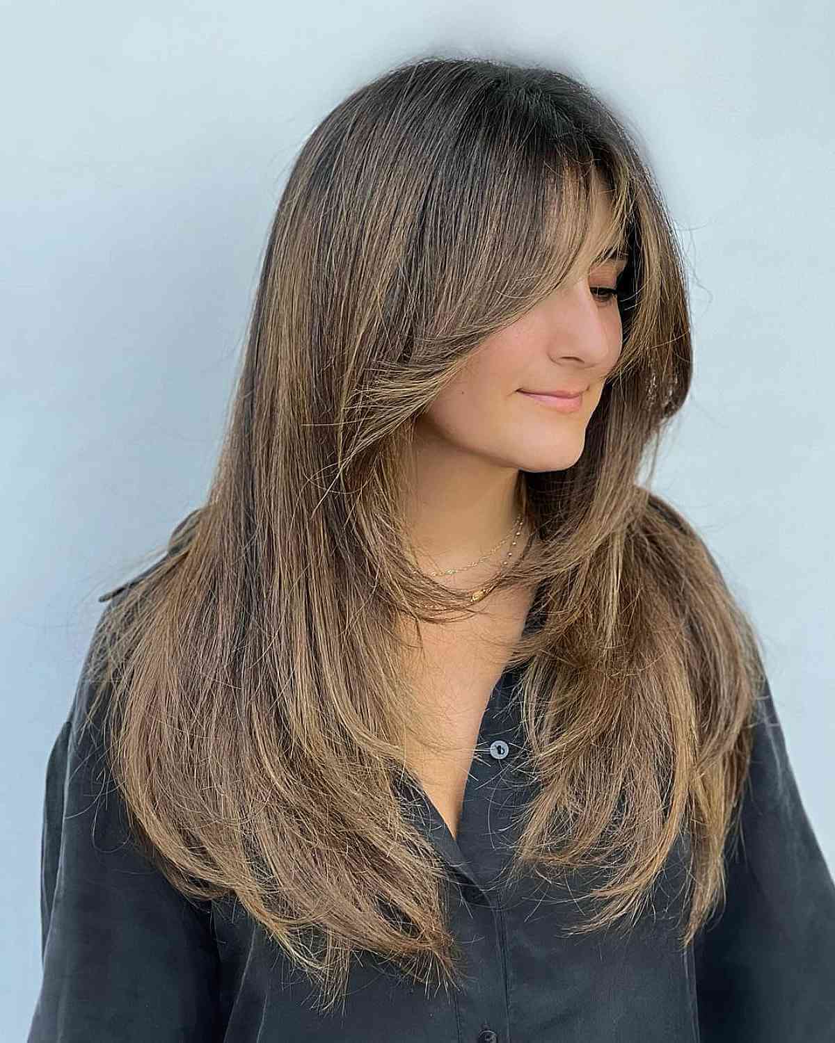 Experience the beauty of dimension with this caramel balayage, a perfect fusion of deep browns and inviting, light-reflecting caramels. Ideal for medium density hair, the long layers introduce movement, while the face-framing highlights enhance the appearance, flattering oval shapes. It’s a fashionable option for those aiming to elevate natural tones with low-maintenance upkeep. Keep in mind, the caramel may fade, requiring color-safe care to maintain its brilliance. This technique, with its wavy styling, radiates versatility and elegance.