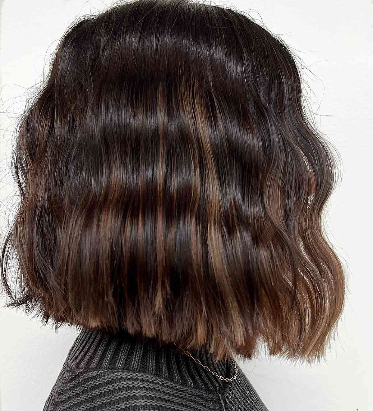 Achieve that stunning light-reflective effect on your luscious chocolate hair by adding these delightful warm highlights! Perfect for those with naturally wavy hair of any length!