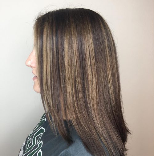 A warm caramel blend on your brunette locks provides a distinctive contrast for a more striking and multi-dimensional hairstyle. These caramel brown highlights feature a versatile shade that complements all skin tones beautifully.