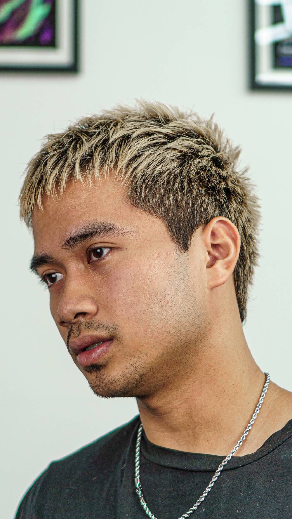 This textured short crop features a unique frosted blonde on top with darker roots, perfect for adding depth. The hair is cut to a shorter length, making it ideal for those looking for a low-maintenance style that still packs a punch. This cut works well for straight or wavy hair types and can suit various face shapes. Just be mindful that while it offers a trendy look, maintaining the color can require regular upkeep, especially for those with finer hair.