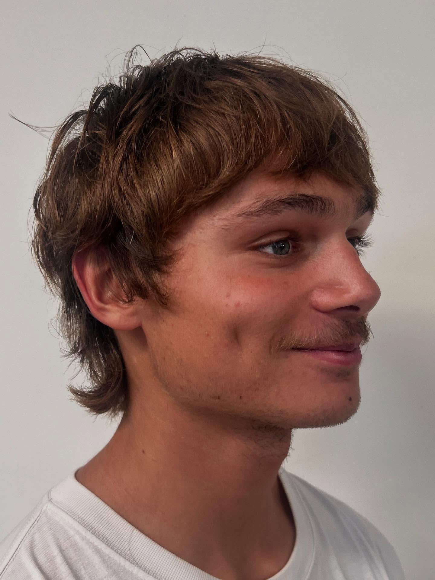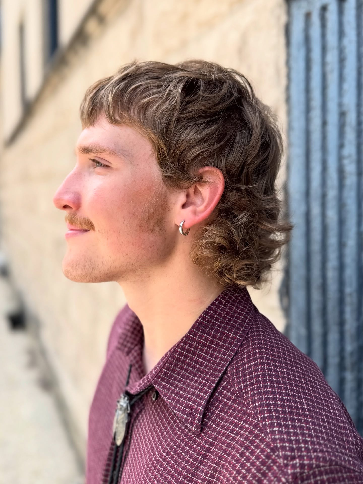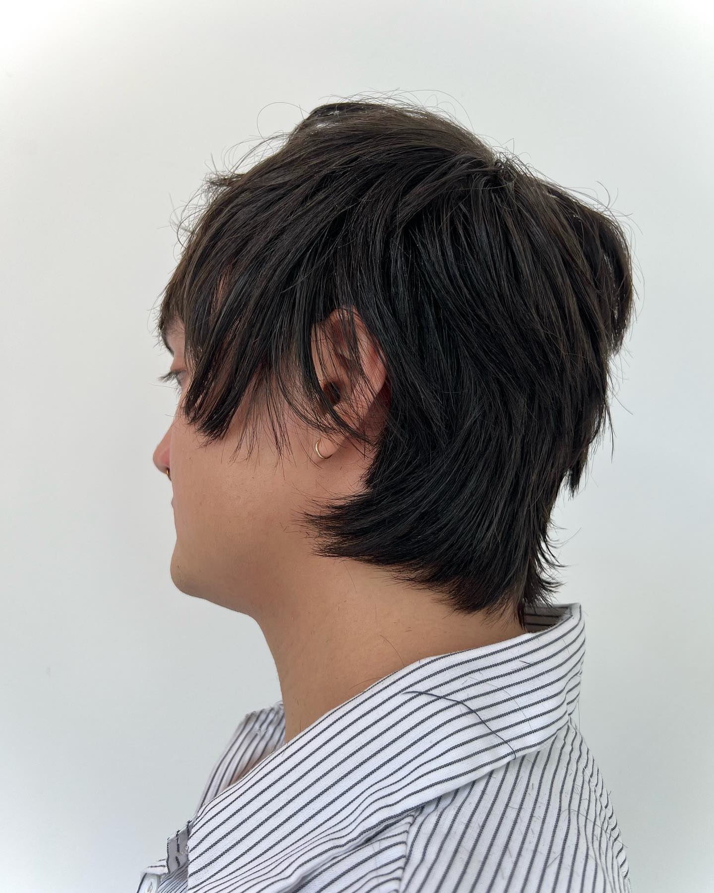 This textured modern mullet features soft layers that add movement and depth. The hair length is medium, with slightly longer layers in the back, which enhances the mullet’s classic shape. The model has fine to medium hair density, making this cut suitable for those wanting a bit of volume without excessive bulk. This style is great for oval or heart-shaped faces, offering a fresh twist on a retro look. While it’s trendy, it may require more maintenance to keep those layers looking sharp.