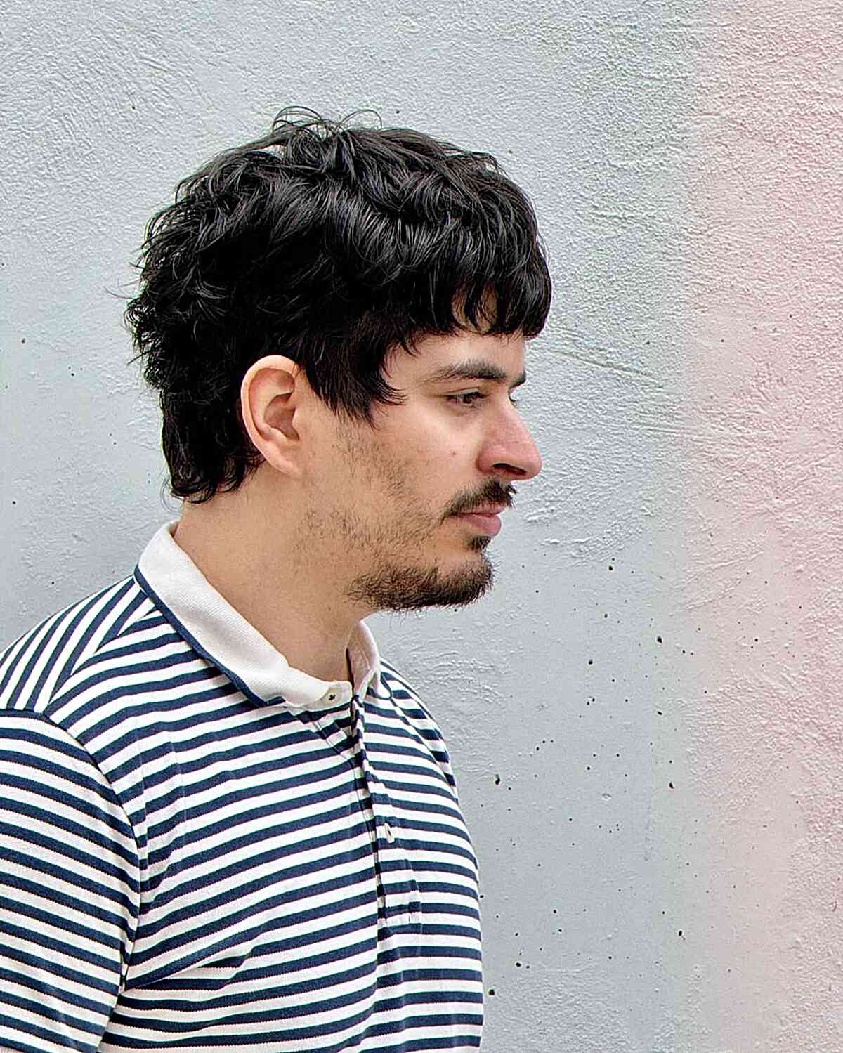 This textured mod cut features mid-length layers, perfect for enhancing natural waves. The model’s thick, curly hair is styled to create volume while maintaining a clean silhouette. This cut suits various face shapes, particularly oval and square, and works beautifully with a casual or polished look. To style, use a lightweight mousse for texture and a bit of pomade for definition. This cut is distinctive for its effortless, tousled appearance, making it ideal for a low-maintenance yet stylish option.
