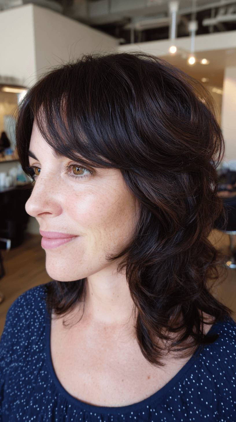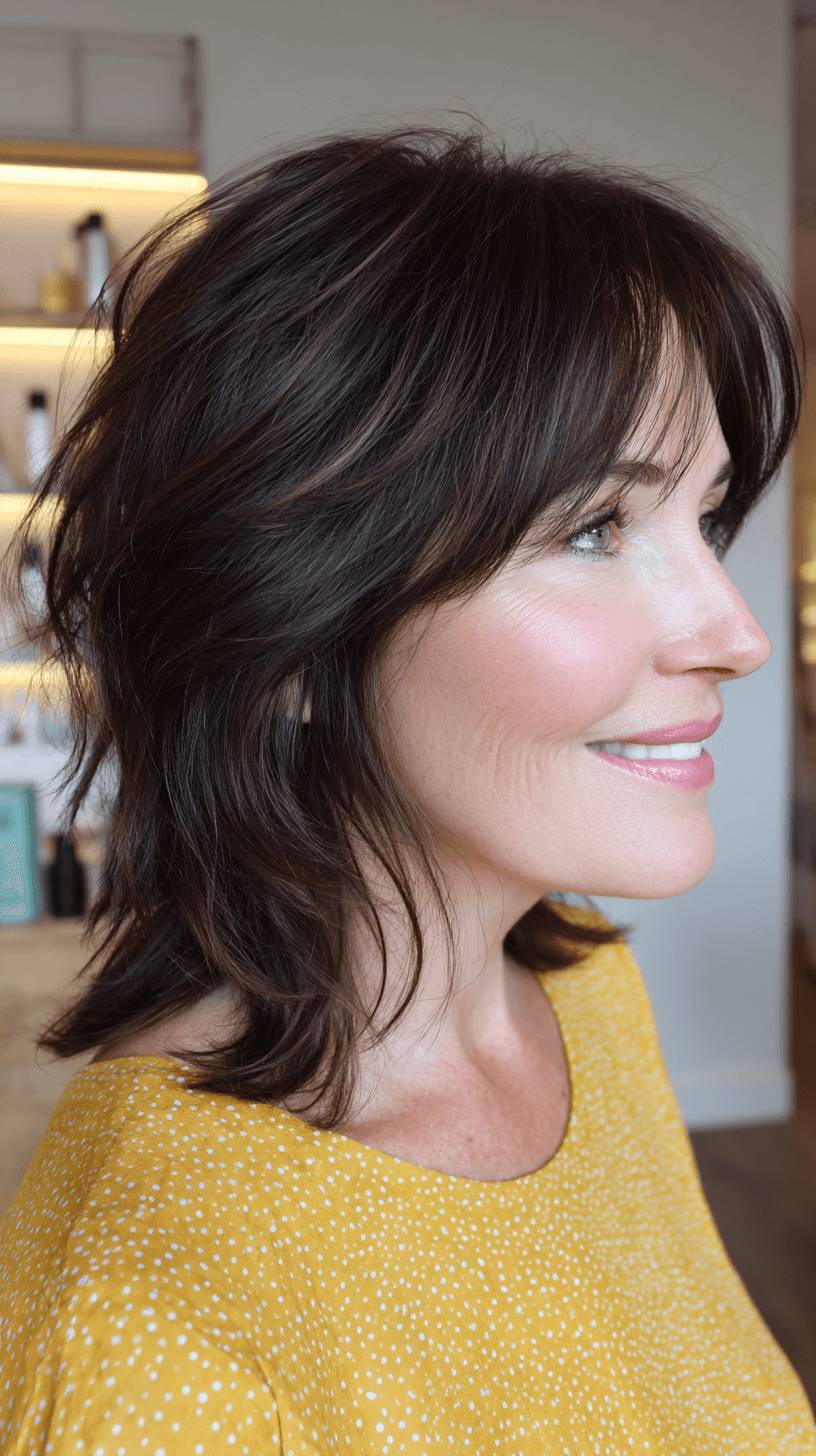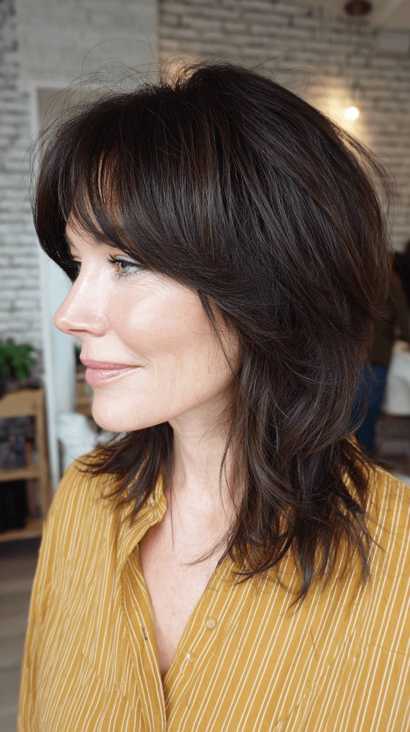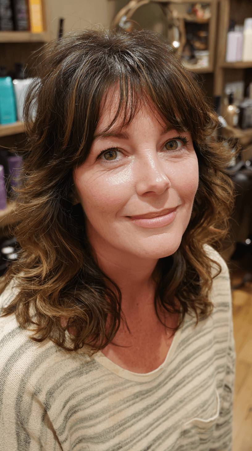 This chic textured mullet features soft, face-framing layers that beautifully enhance the model’s natural wave. The shoulder-length cut offers versatility, allowing for both a polished look or an effortless, tousled finish. Ideal for medium to thick hair types, this style adds volume and movement, making it age-appropriate for many. However, it may require regular styling for maintenance. The subtle layers around the face also help define and soften facial features, making it a fantastic choice for various face shapes.