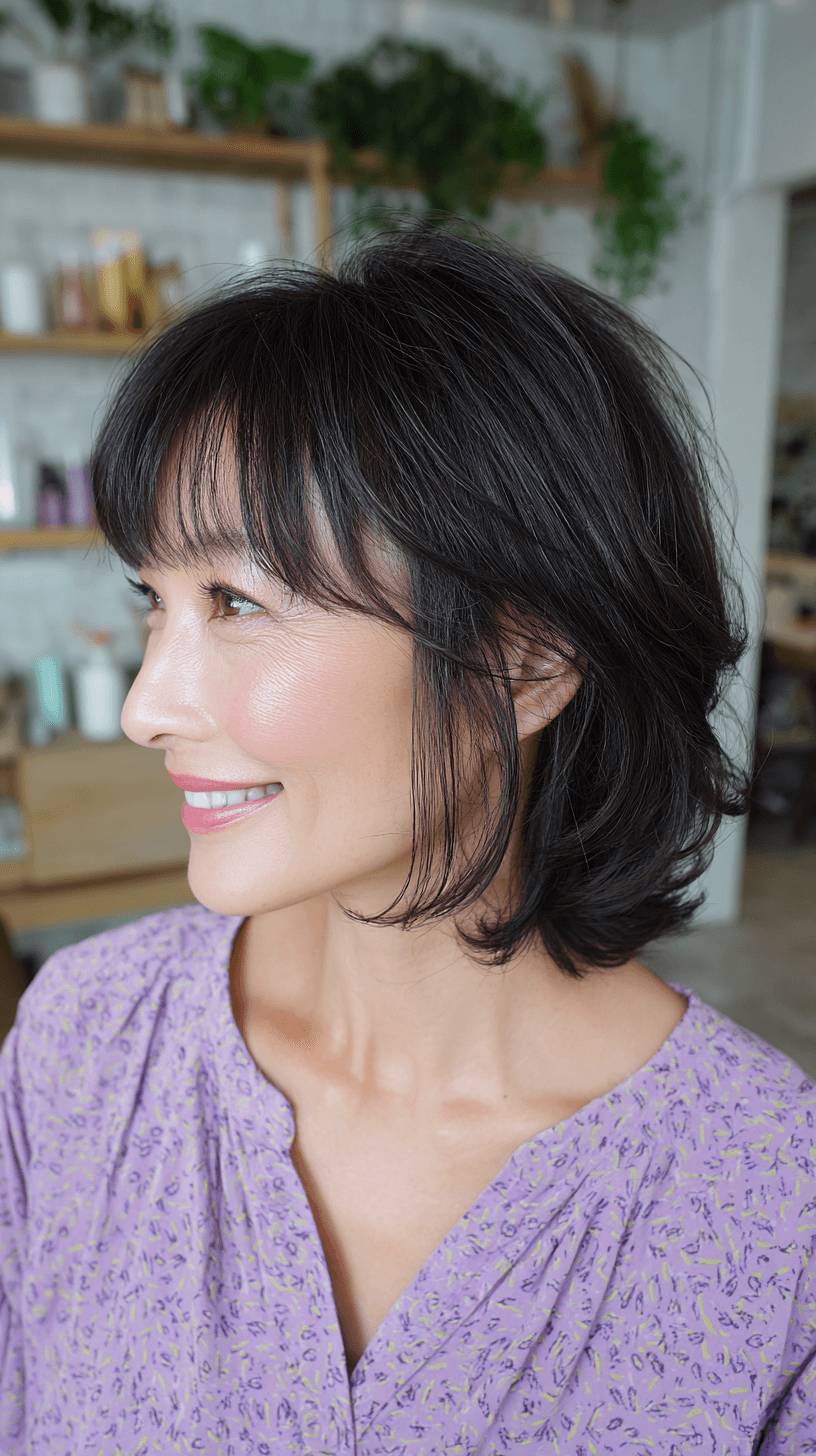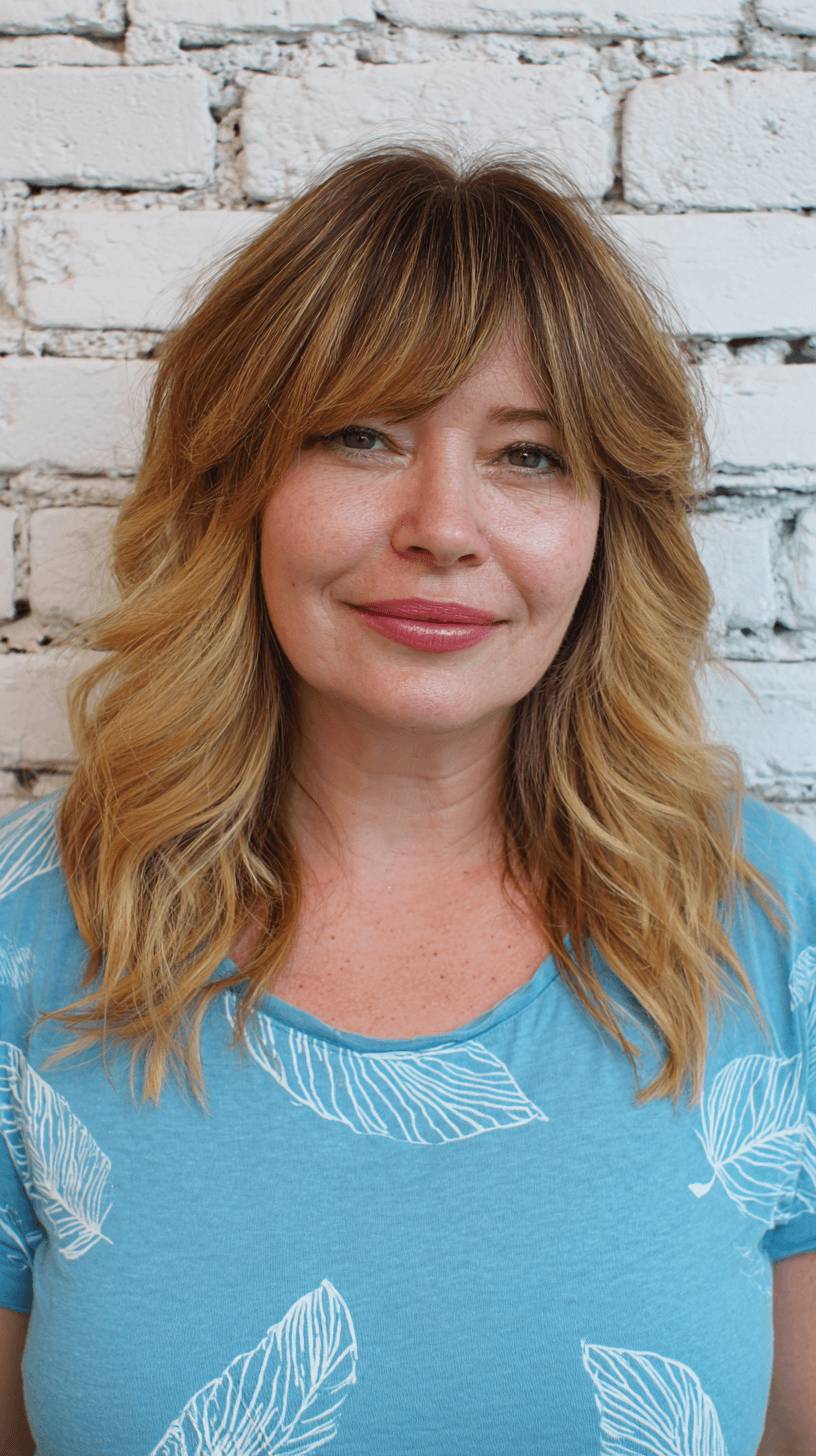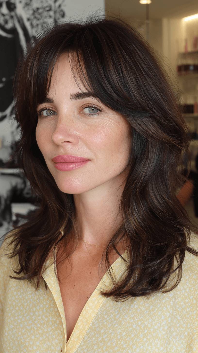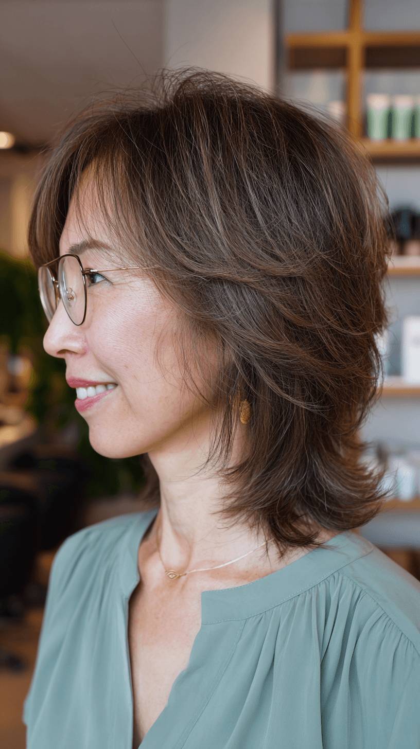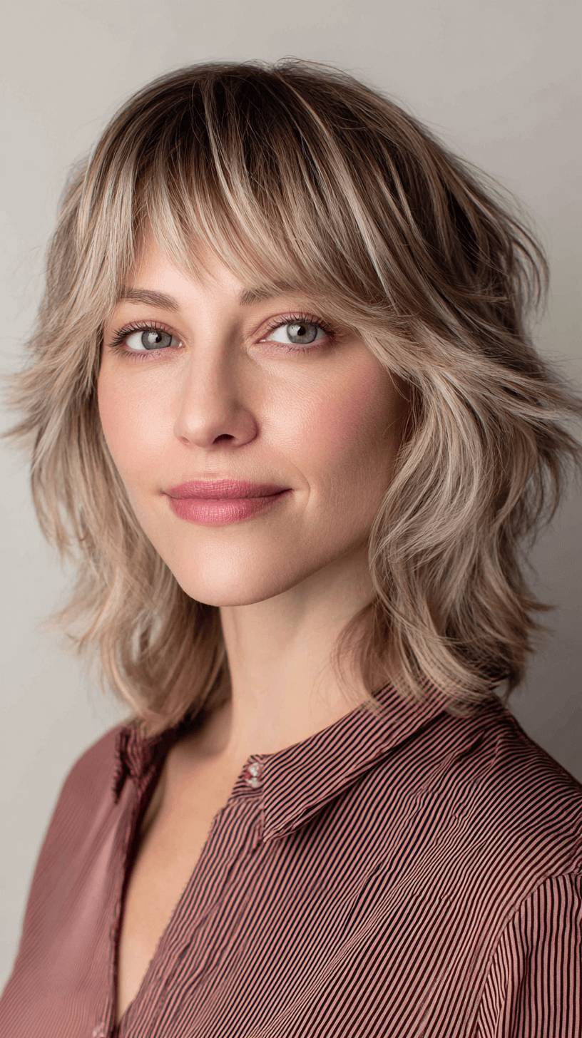 This chic textured mullet features soft, face-framing layers that beautifully enhance the model’s natural wave. The shoulder-length cut offers versatility, allowing for both a polished look or an effortless, tousled finish. Ideal for medium to thick hair types, this style adds volume and movement, making it age-appropriate for many. However, it may require regular styling for maintenance. The subtle layers around the face also help define and soften facial features, making it a fantastic choice for various face shapes.