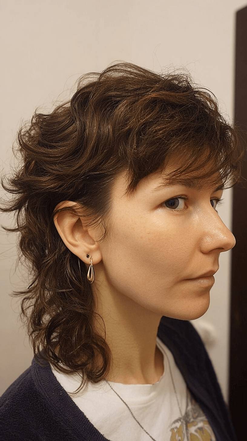 This textured mullet features soft, face-framing layers that beautifully enhance the model’s profile. The hair is medium-length with a natural wave, offering a touch of effortless elegance. It’s perfect for those with fine to medium hair density, as the layering adds volume without heaviness. One unique aspect is the subtle shine, indicating healthy hair care. While this style is versatile and trendy, it may require regular styling to maintain the shape. Ideal for round or oval face shapes, this cut can refresh your look!