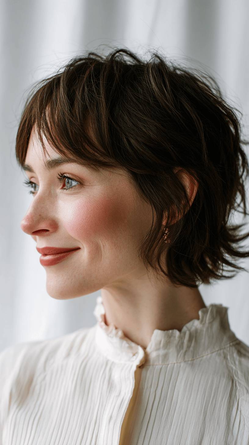 This textured short mullet features soft layers that beautifully frame the face, making it ideal for oval or heart-shaped faces. The hair appears to be medium-density with a natural wave, adding volume without overwhelming fine hair types. This cut is low-maintenance yet stylish, perfect for busy moms like us. However, the layers may require regular trims to maintain their shape. The subtle highlights add depth, making it a great option for anyone looking to refresh their look without drastic changes.