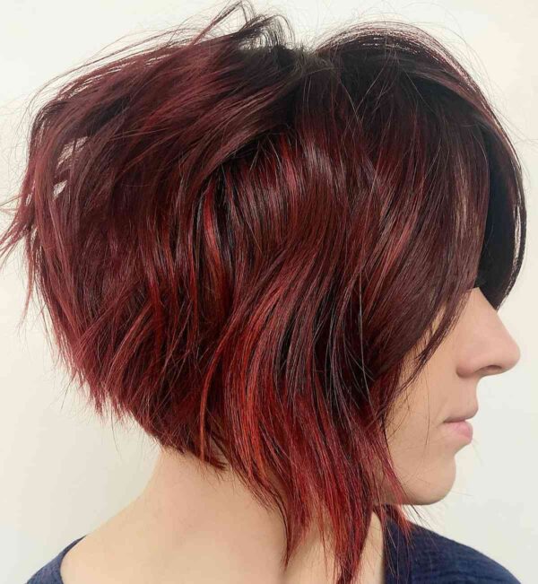 This dark hair with red highlights is styled in a stacked A-line bob. The base color is rich brown with auburn accents. “This is ideal for those with dark hair looking to introduce some richness and texture to their color, especially for the autumn season,” explains Brooke Abbate, a stylist from Tulsa, OK.