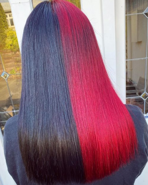 Half black, half cherry red long locks offer a vibrant and daring approach to personal style. To achieve this striking look, your hair needs to be receptive to red tones and have the capacity for color lifting. Consult your stylist to determine if a half-and-half shade is suitable for you.