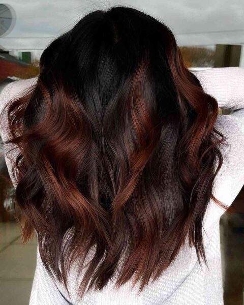 This one’s a delightful interpretation of vibrant, rosy red highlights against dark black hair. Notice how beautifully the red-brown hair highlights complement the black hue of the base to accentuate the waves, making them appear soft yet glamorous!