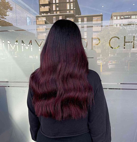 Such crimson and ebony hairstyles will flatter most women. “However, this isn’t suitable for women with naturally light regrowth; as it goes out, it would be more noticeable. A quality color-safe shampoo and treatment are essential. Use heat protection when styling to maintain the color,” Oksana recommends.