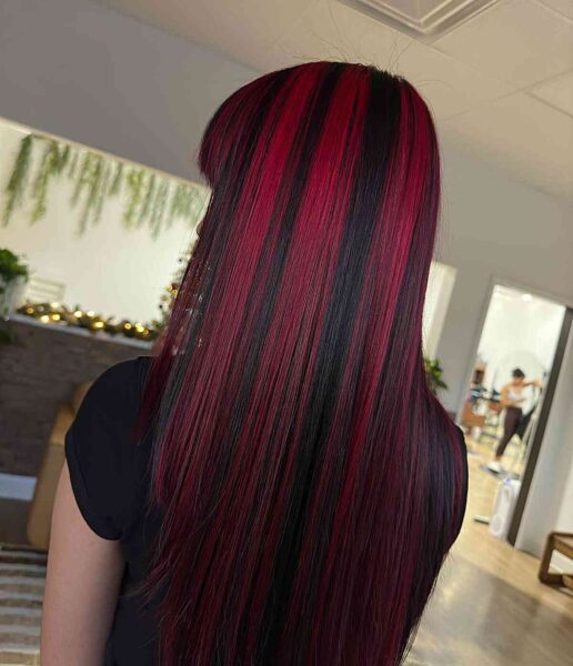 This striking red and black hair color can be sported on all hair types. Warren states, “Generally, it works best on individuals who enjoy bold and vivid shades! Vibrant tones such as these black hair highlights last longer on those who don’t wash their hair frequently. As with any red hair color, use color-safe products when washing and styling!”