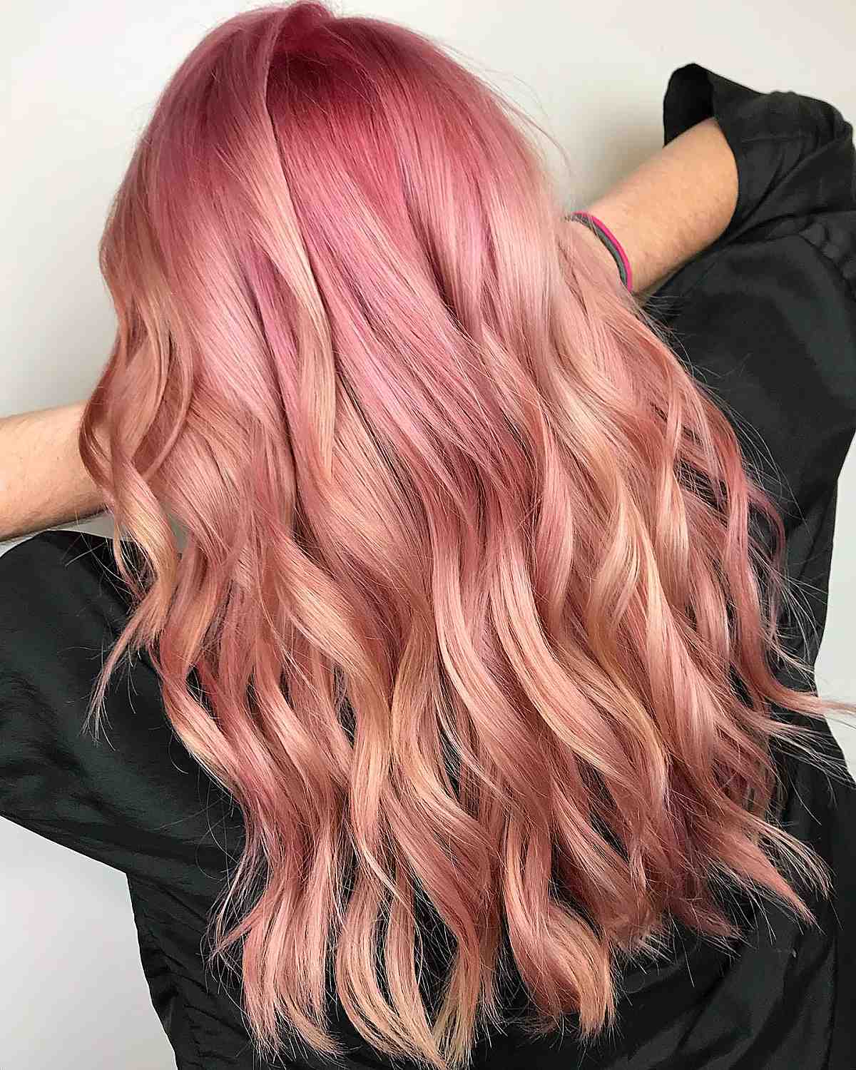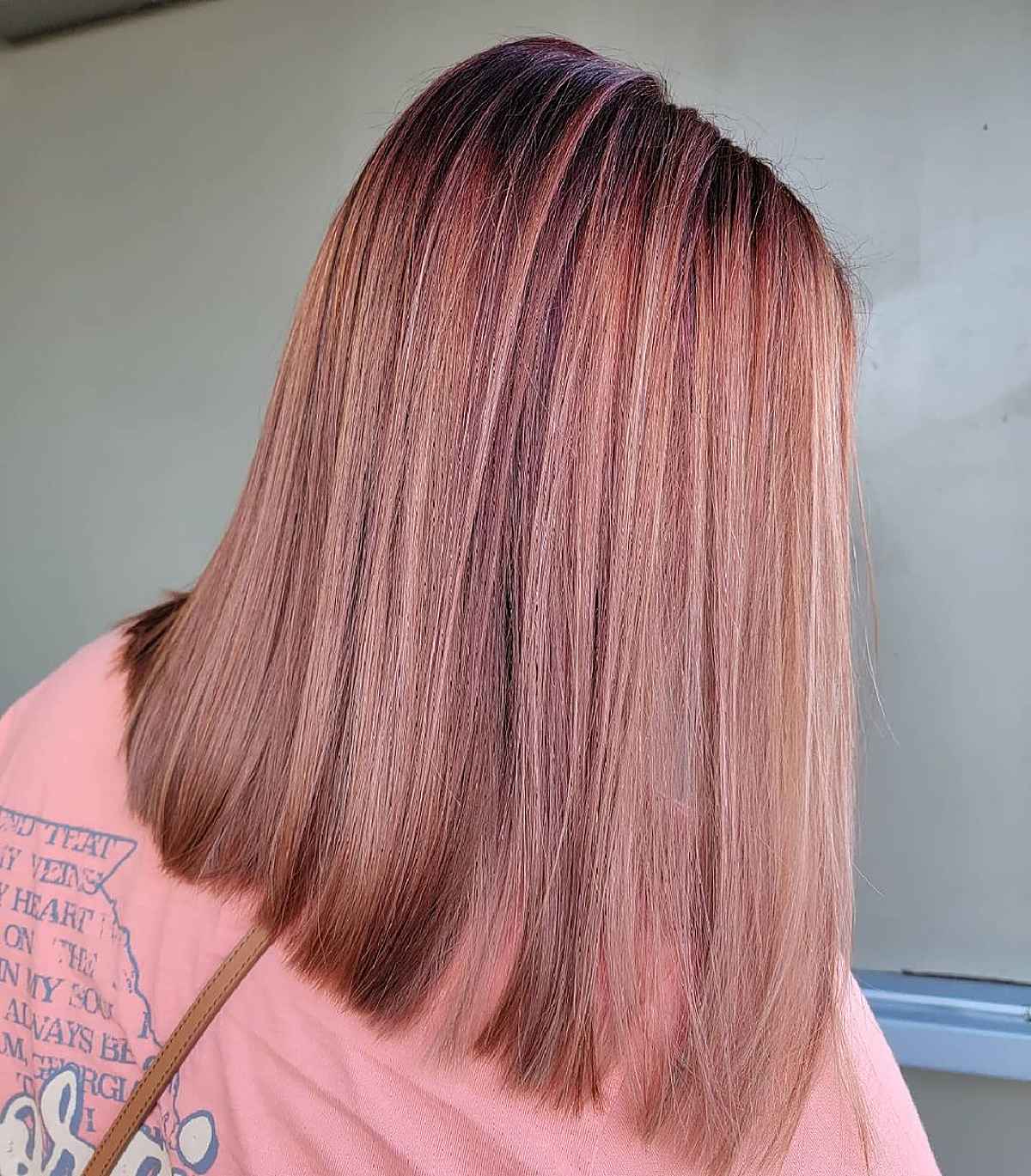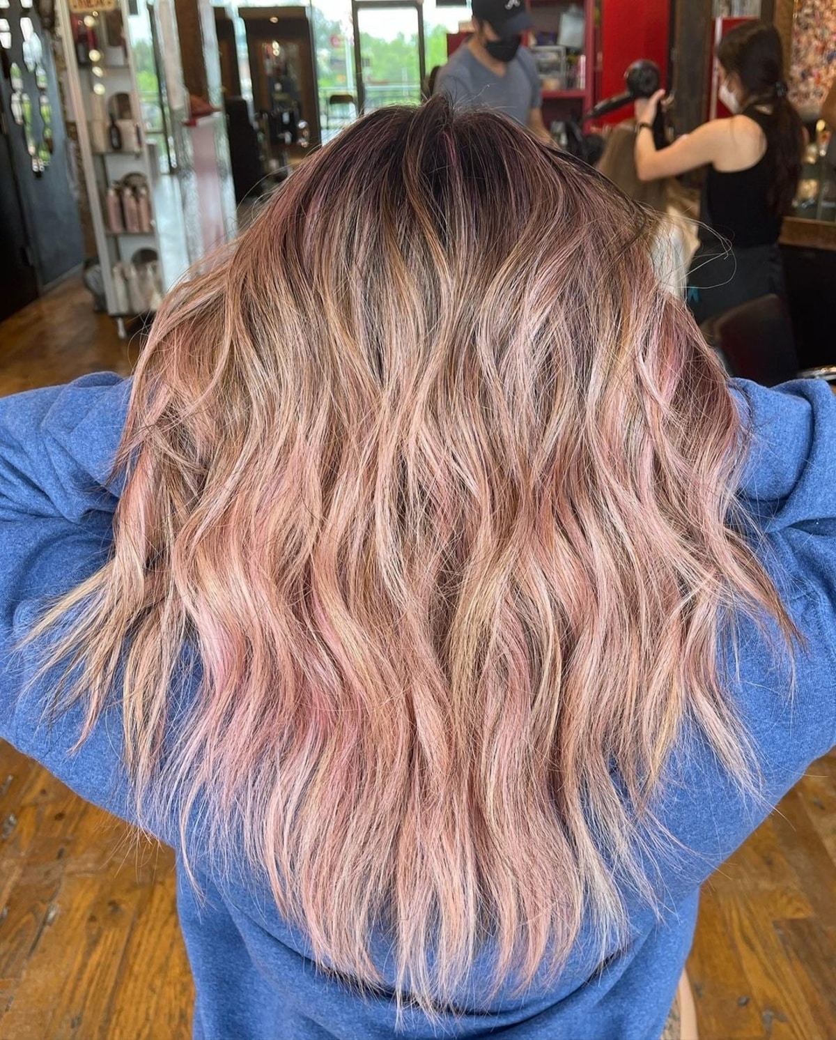 Rose gold hair shades with pink highlights is a gentle pink hue infused into blonde hair highlights. This look is ideal for individuals seeking a hint of playful color, as pastel pink shades tend to fade more rapidly. To achieve this style, consult your colorist for a pastel rose gold tone with a shadow root for added depth.