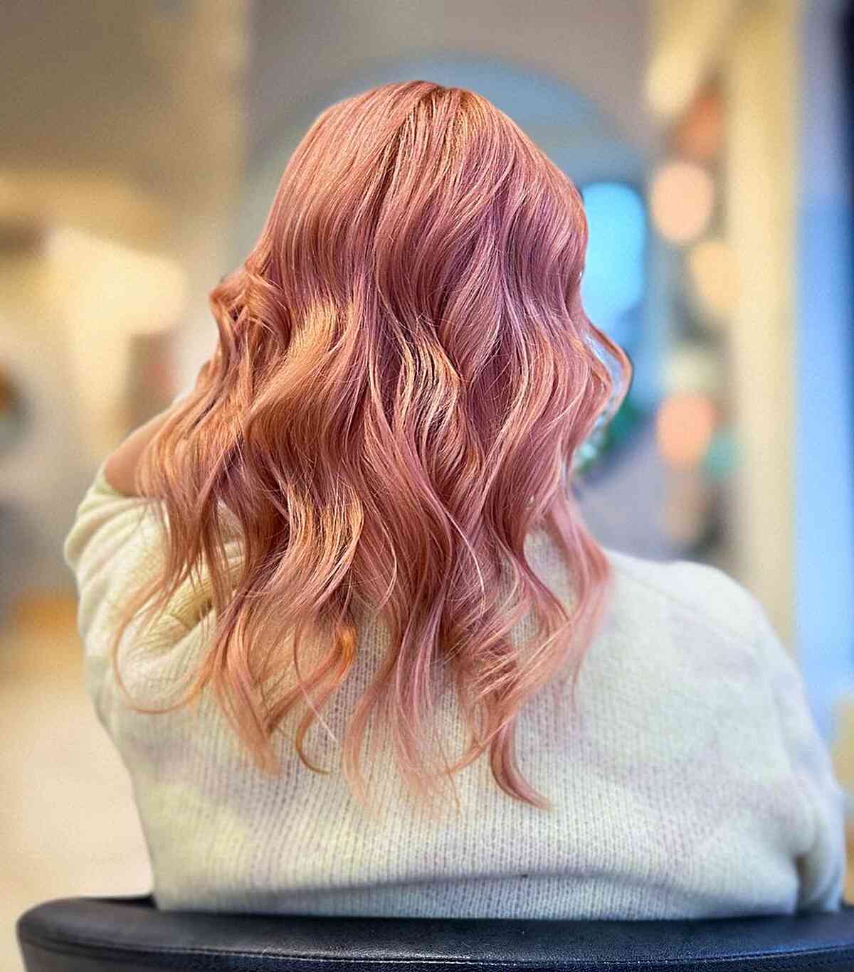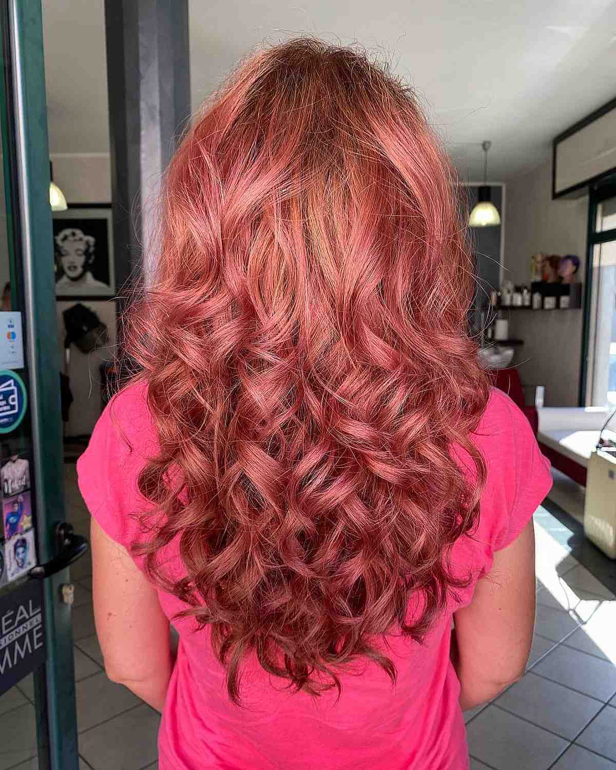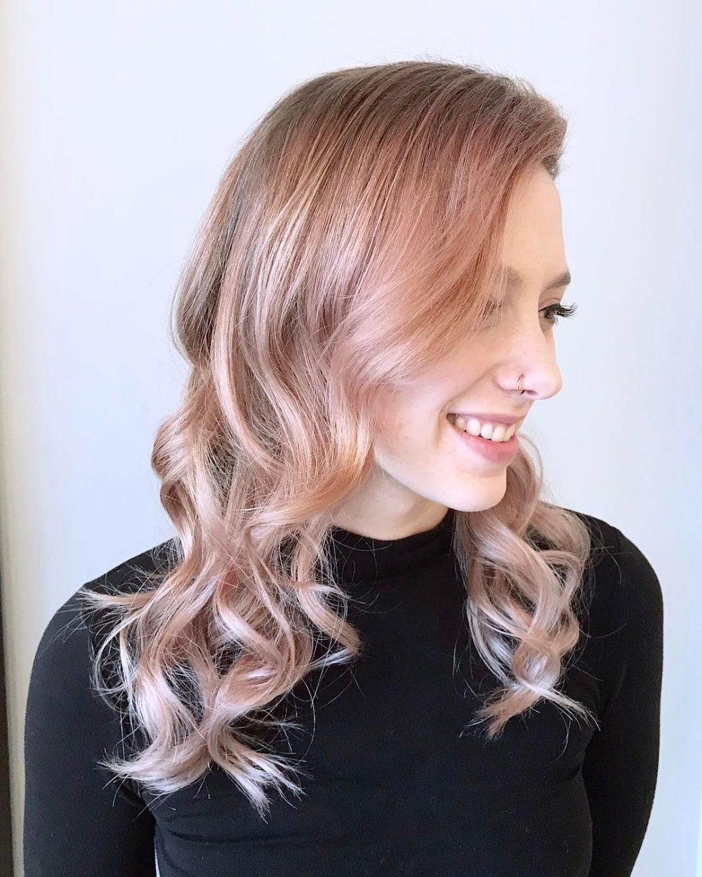Discover a stunning rose gold hair dye! The curls and hue are perfect for women with fair or light skin tones seeking a chic, playful dimensional transformation for their hair.