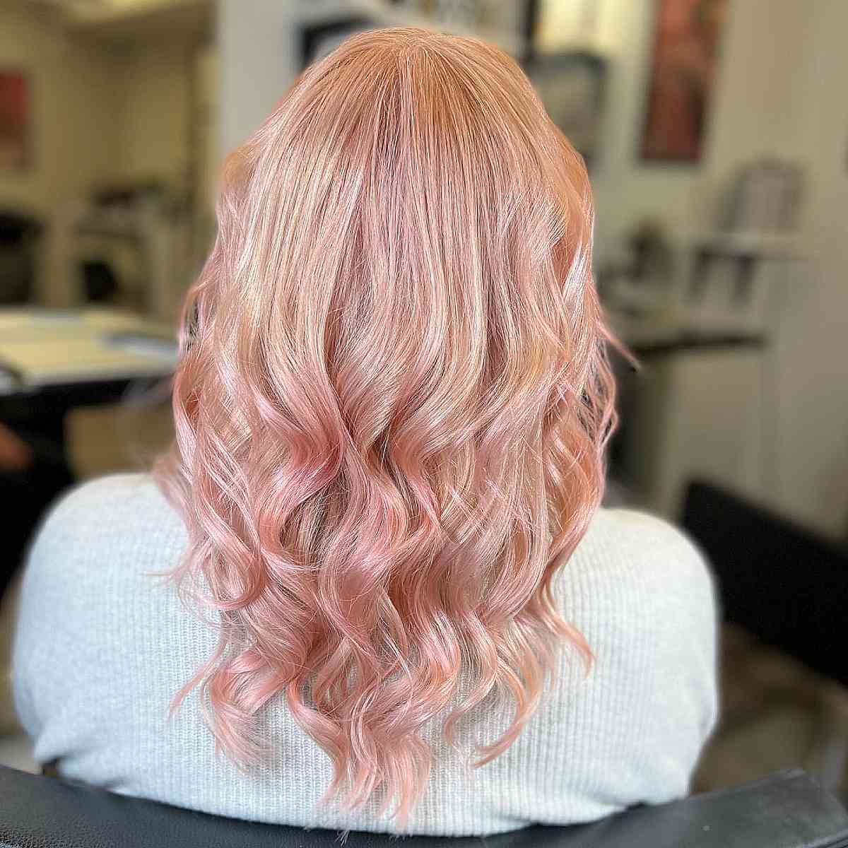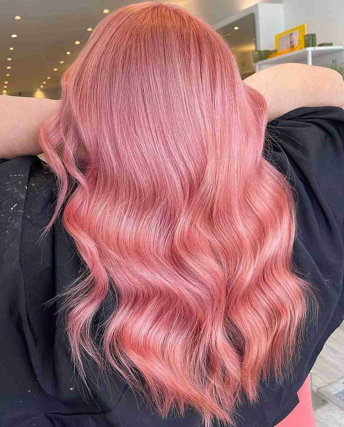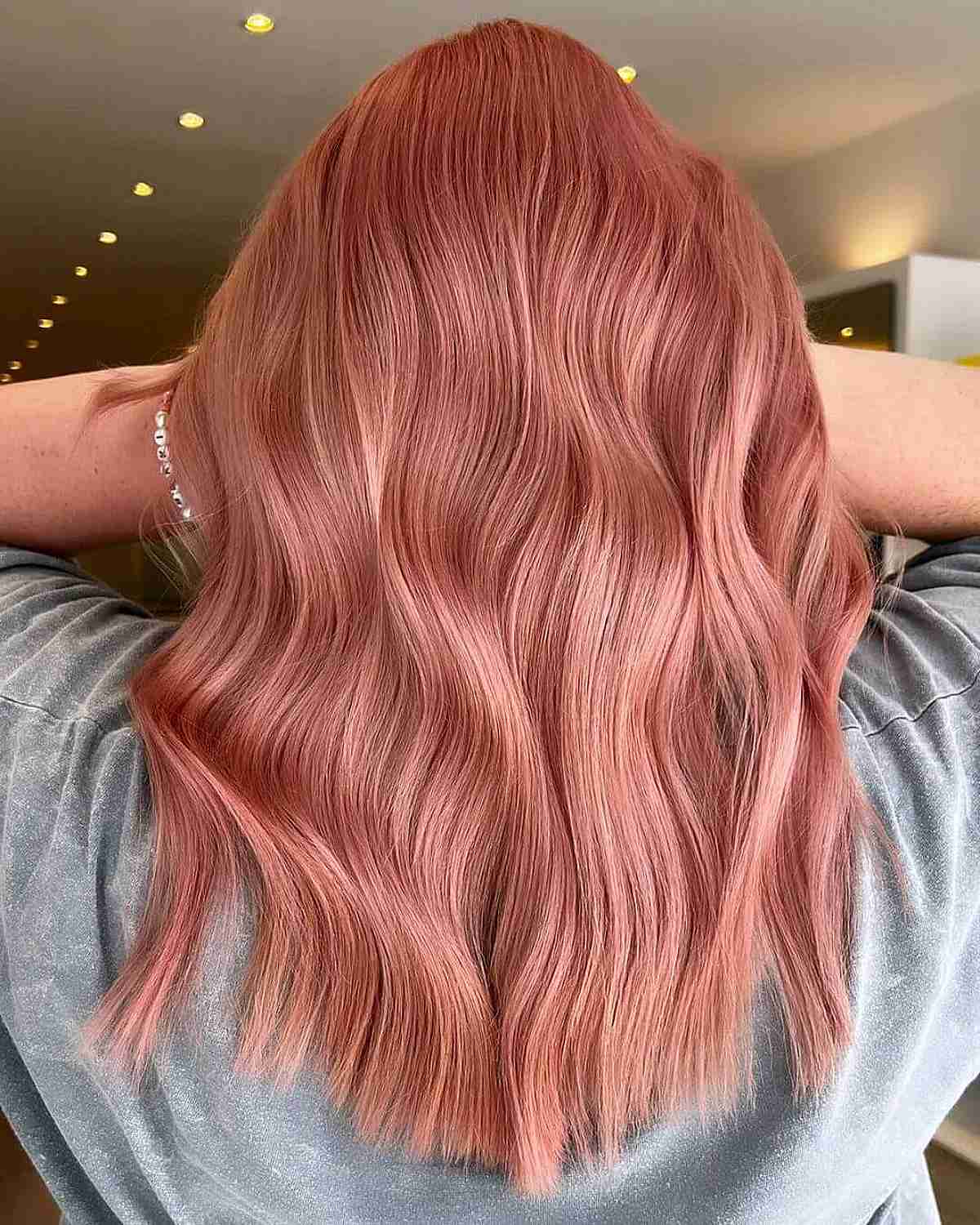 Discover a stunning rose gold hair dye! The curls and hue are perfect for women with fair or light skin tones seeking a chic, playful dimensional transformation for their hair.