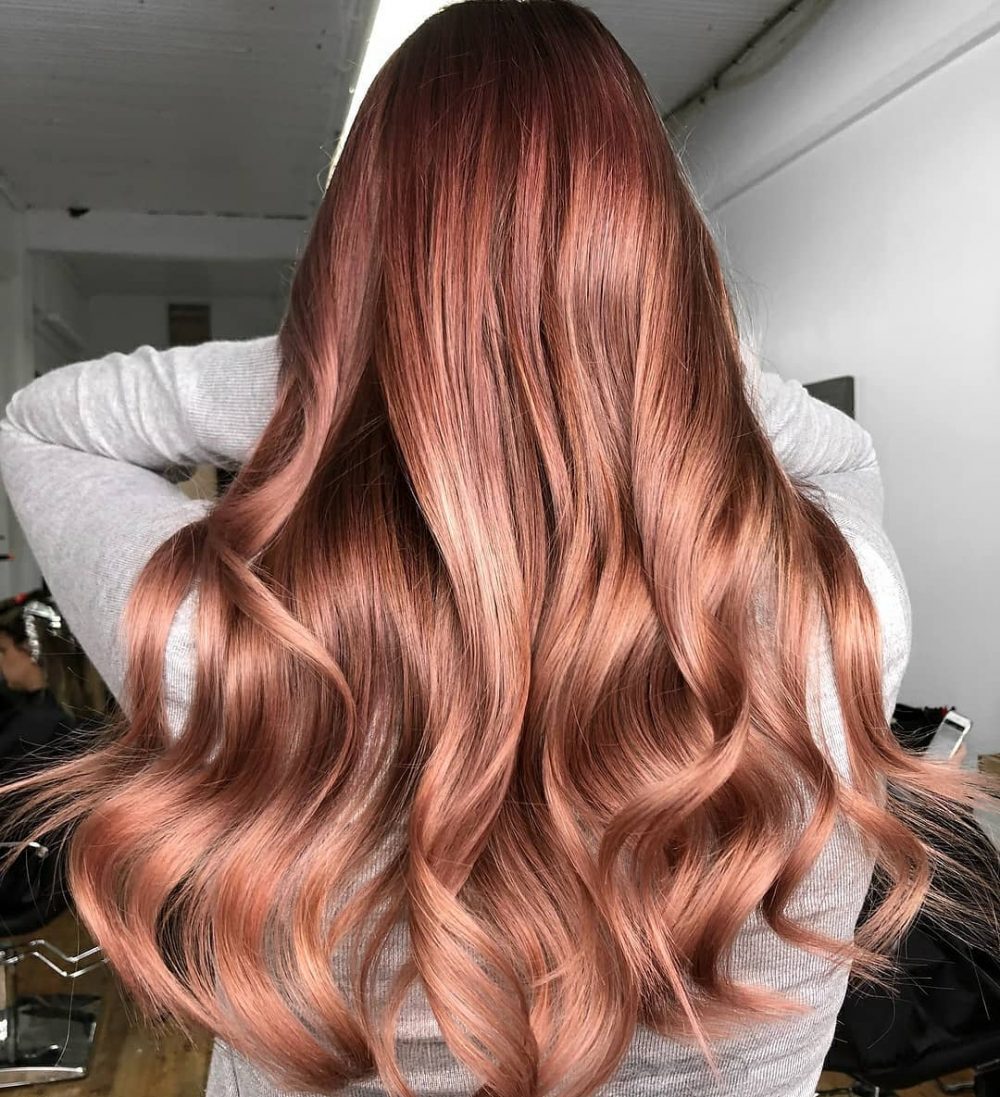 This is a stunning illustration of how this rose gold tone can enhance brunette hair. Hair styled in rose gold with deep roots like this looks fabulous on thick, voluminous waves.