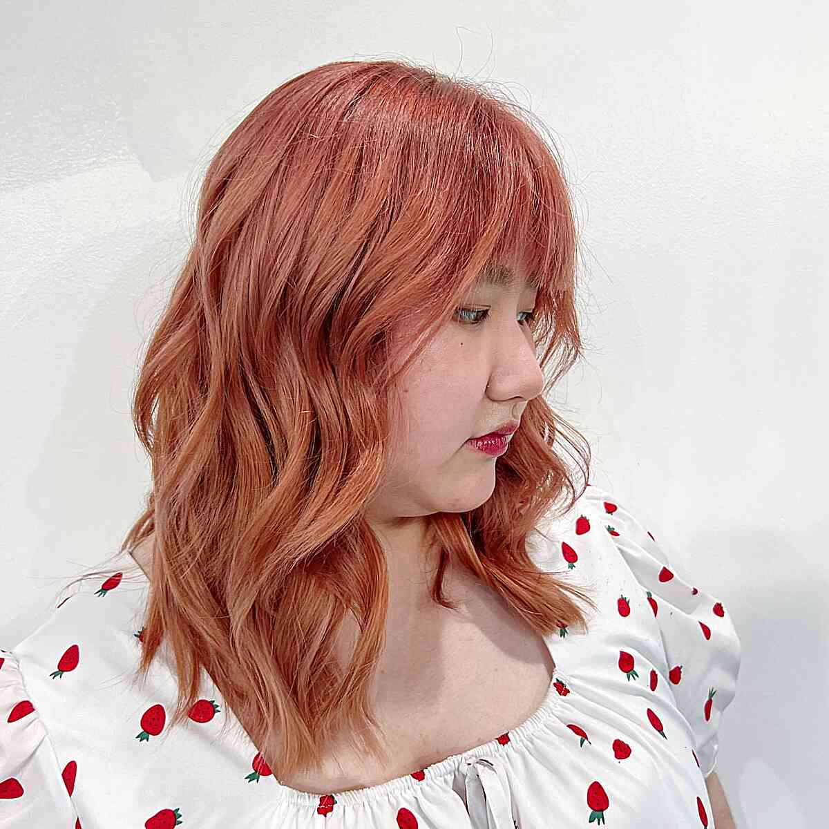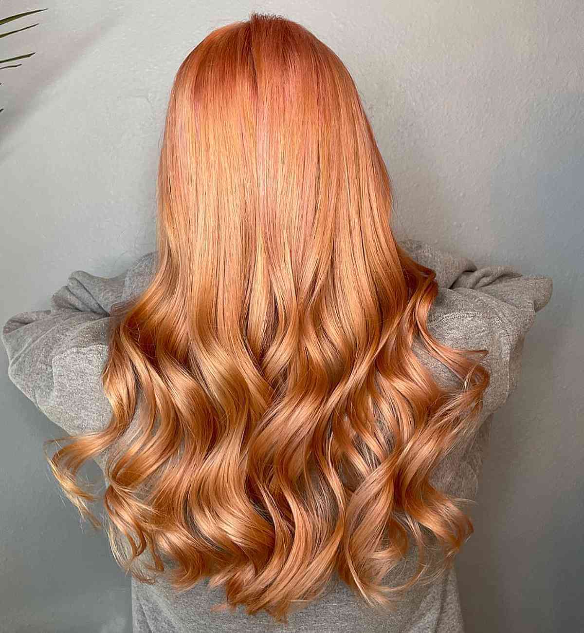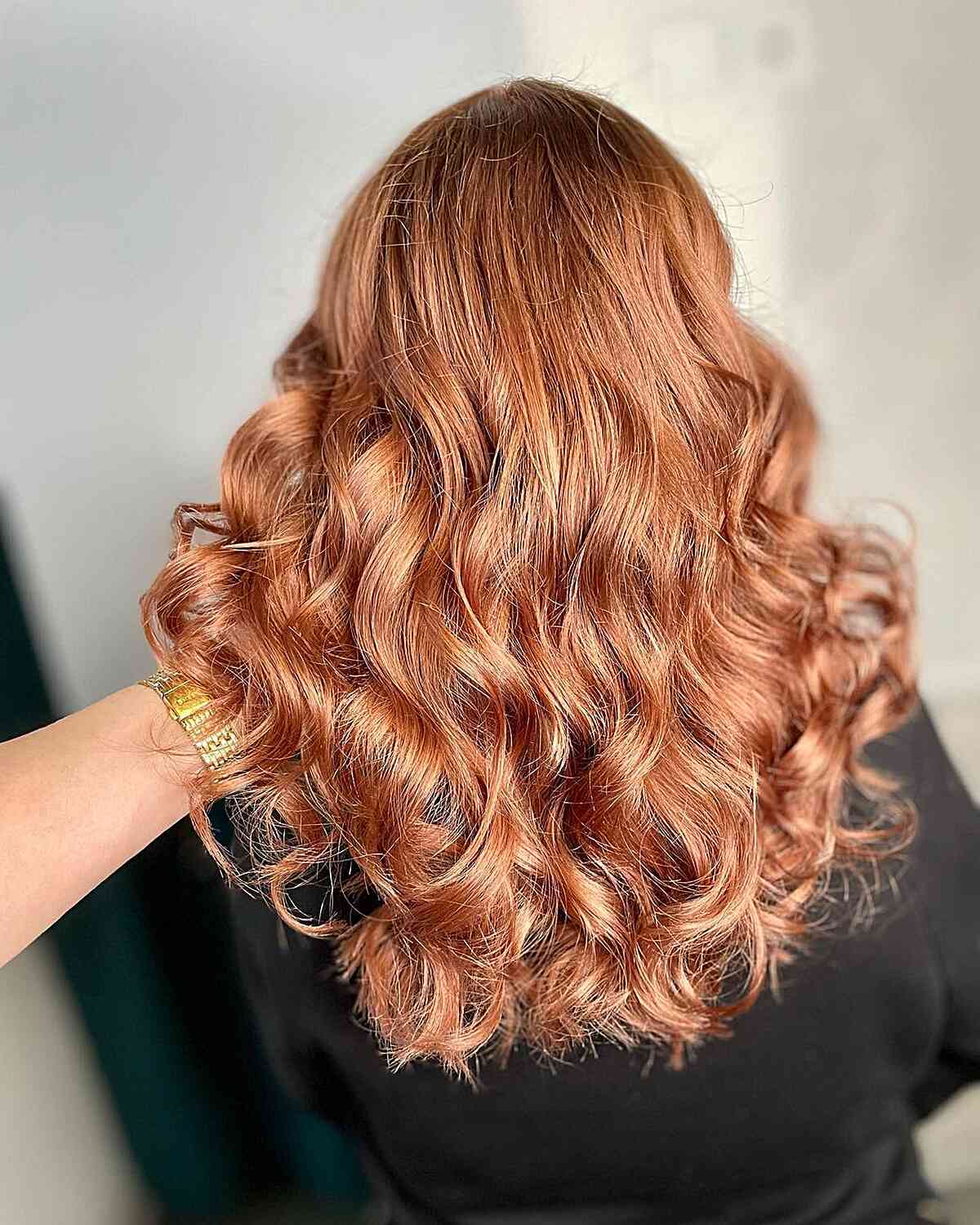 Try soft rose gold for loose curly locks to infuse gentleness into your classic ginger hair color. This might be a wonderful option if you’re weary of your bold red hair. Crafting gentle ginger with fully covered roots is crucial to achieve this style. I suggest incorporating cool tones into your copper formula to maintain a refined overall shade.