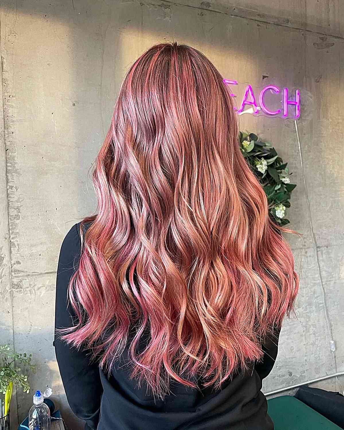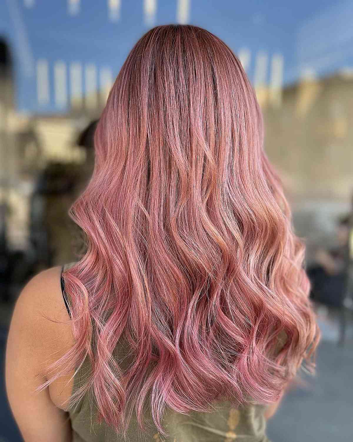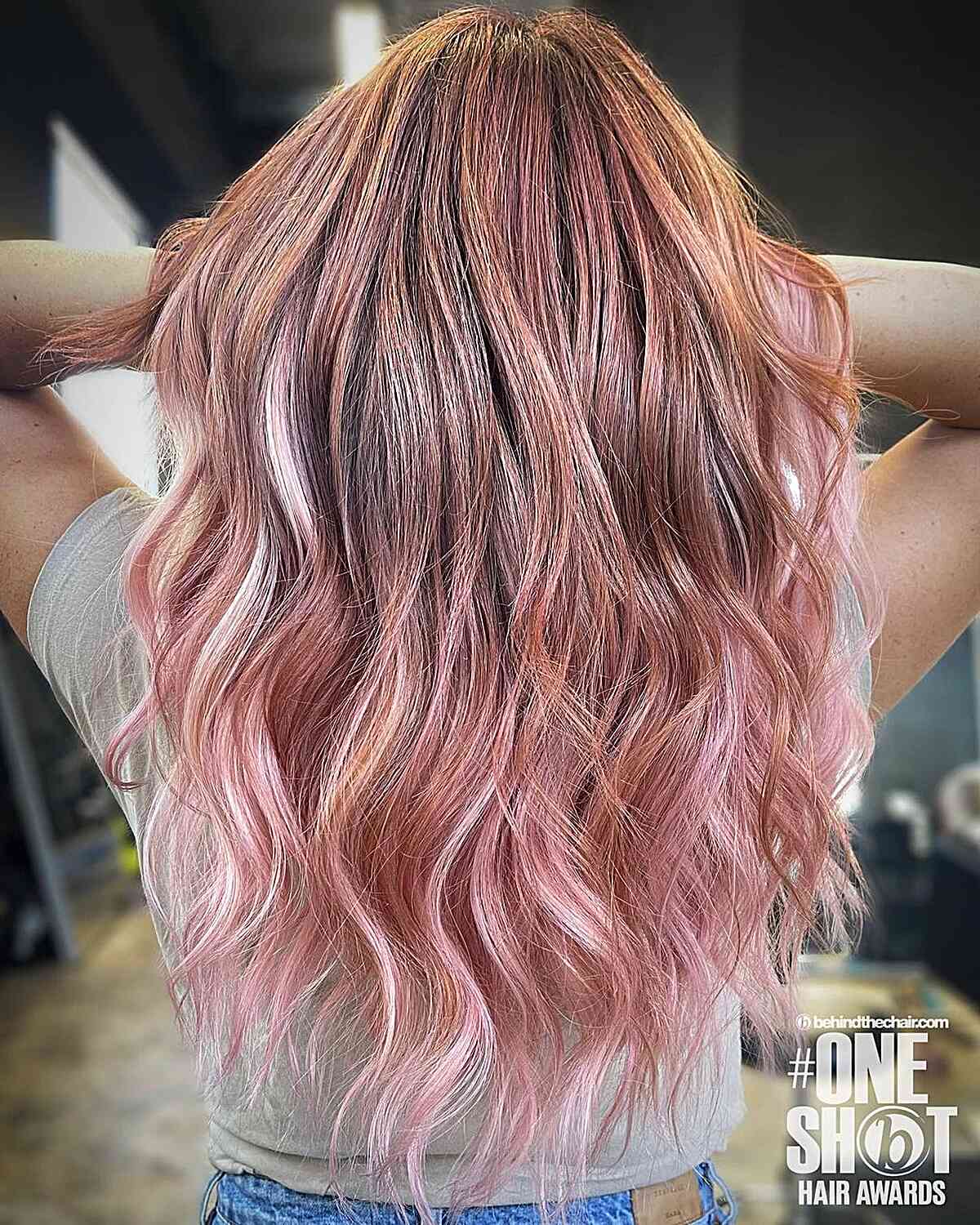 Long wavy hair with layered rose gold highlights is all the rage at the moment. Opt for a rose pink with blue undertones for a striking look on long hair. Consult your stylist about incorporating lighter highlights for enhanced dimensions. Alternatively, consider adding balayage to capture varying tones on different strands of hair. Set your hair in some rollers, and you’ll attract attention, showcasing all that dimension.