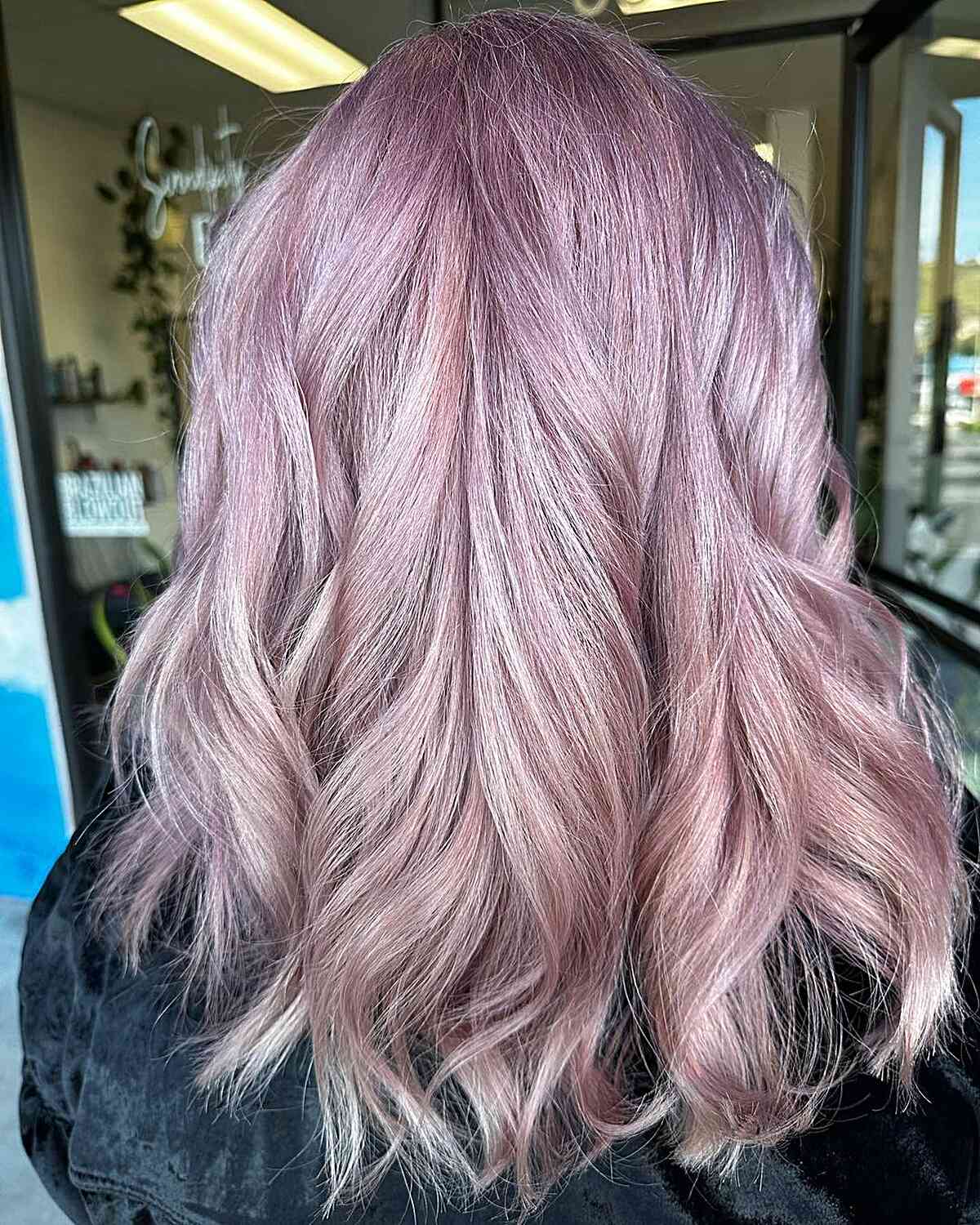 Choose radiant rose gold along with lilac hues, and complement it with a flattering long-layered haircut. My favorite aspect of this rose gold style was experimenting with a mix of warmer shades (copper, gold, pink) and cooler tones (lilac and pastels) – starting from that sleek pinkish coppery base color down to the gleaming metallic lilac and champagne gold highlights.