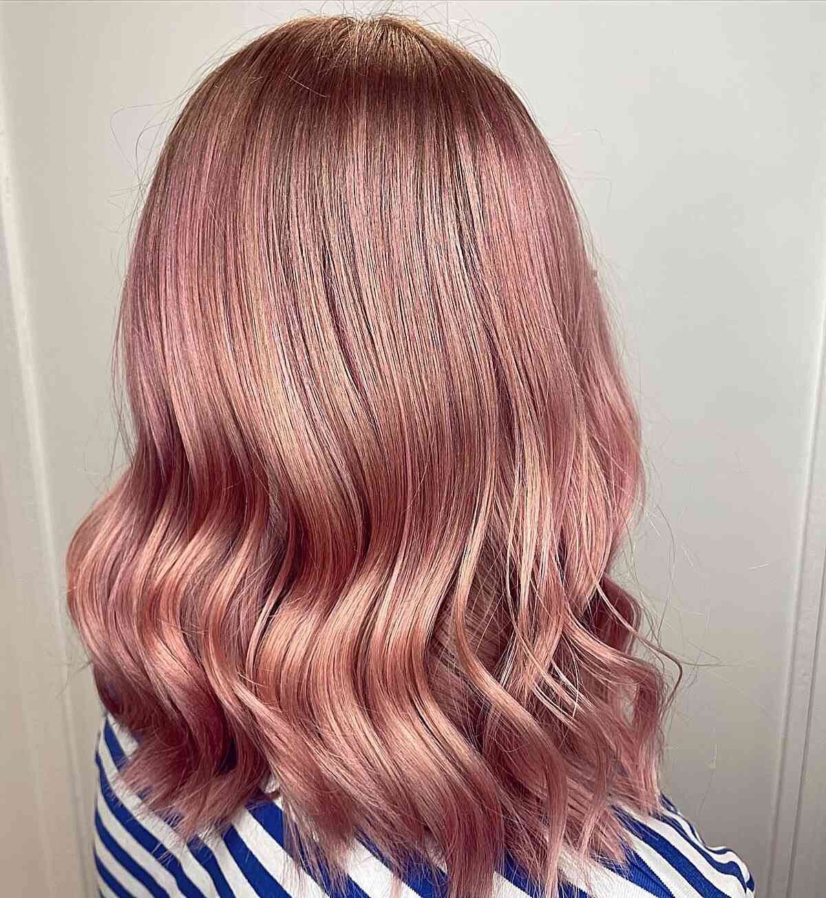 Long hair combined with deep rose gold balayage will illuminate beautifully on warmer skin tones. Additionally, it’s an excellent way to step outside the box and experiment with fantasy colors like this enchanting blush rose gold. The deeper (more pigmented) you go with the rose gold, the longer your color will endure, as opposed to lighter shades that tend to fade within a couple of weeks. Maintain your vibrant color by using a color-safe, sulfate-free shampoo and conditioner, and rinse in cold to cooler water. Consult your stylist to see if they recommend a color-depositing shampoo or conditioner to aid in preserving your color at home.