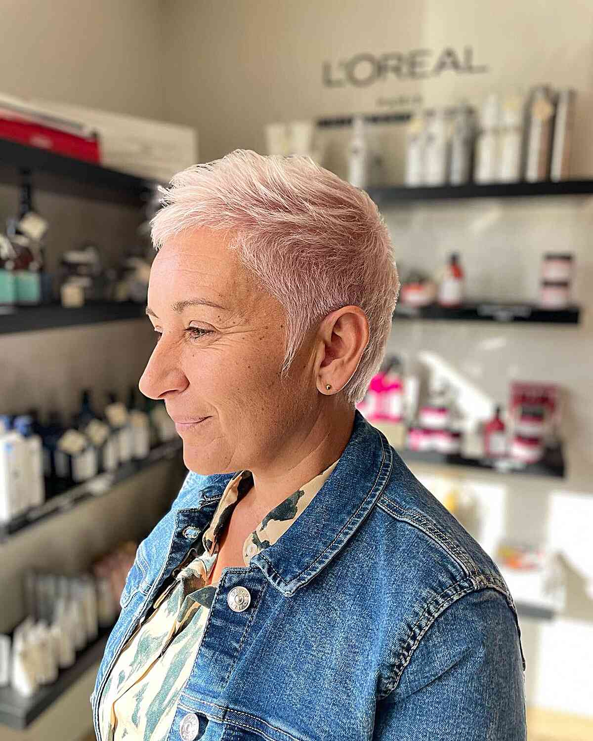 A rose gold pixie cut for mature women with white or grey hair is an exquisite and chic way to add dimension. If you’re considering a playful yet understated change, opt for the rose gold hue. It’s subtle enough that it won’t be too overwhelming, but it still radiates a contemporary vibe. To maintain the desired effect, ensure you keep up regular trims. Use products designed for colored hair. Try Redken Color Extend Magnetics Sulfate-Free Shampoo & Conditioner. Communicate with your stylist about the type of fade you want on the sides to achieve this look beautifully.