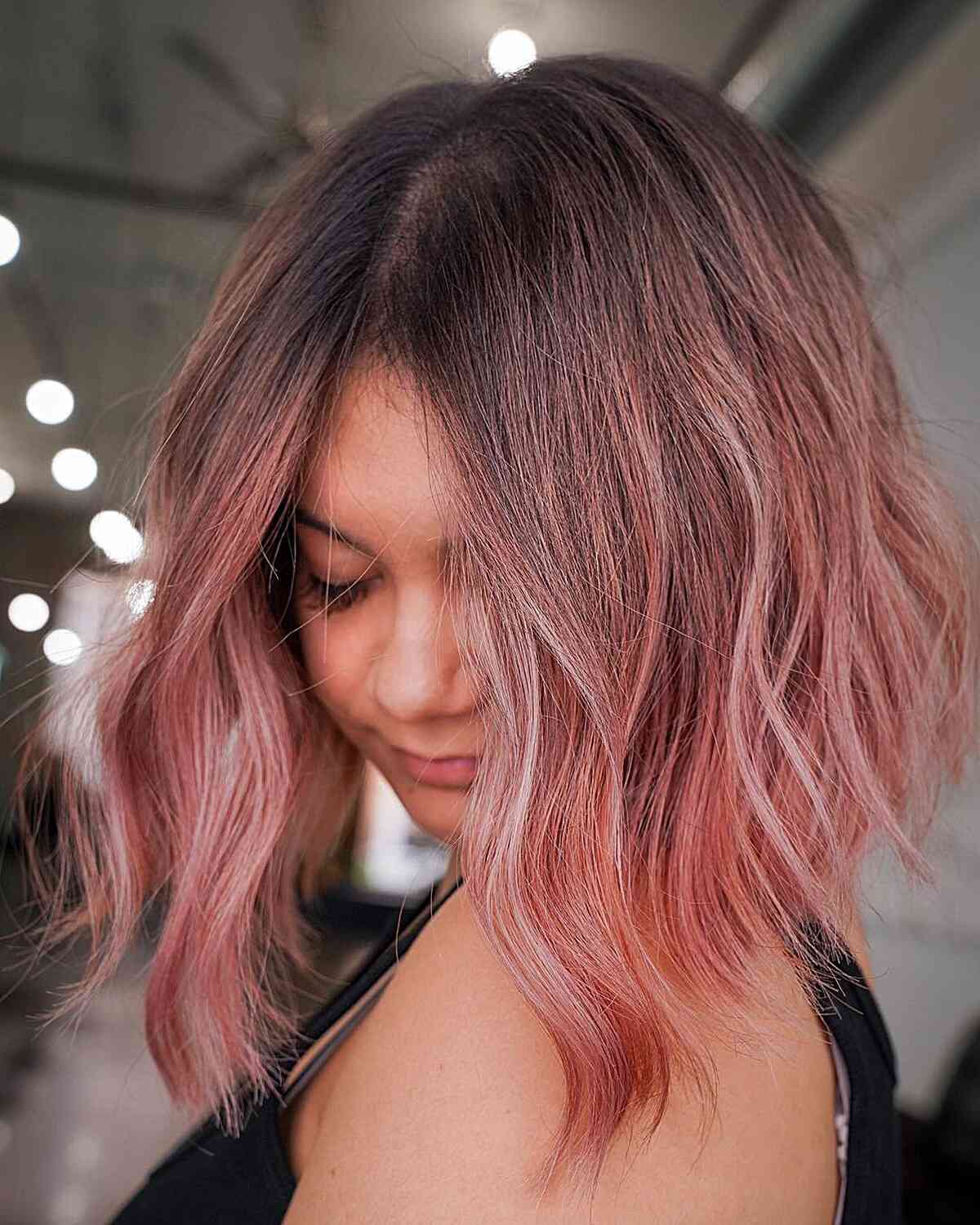 Merge your textured, medium-length locks with hues of rose gold, this vibrant light pink, and shiny gold tones on dark roots, resulting in a stunning rose gold hue that accentuates your lovely eyes!