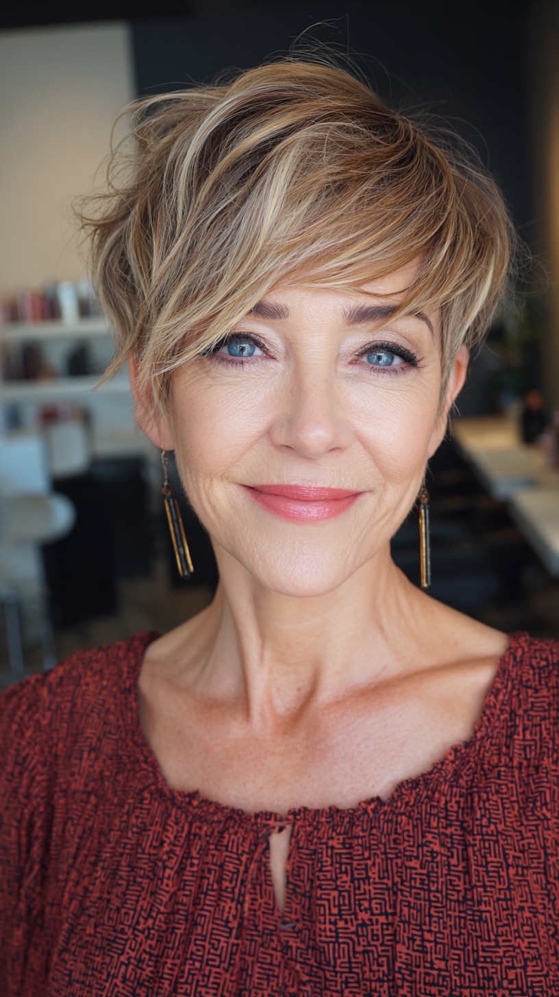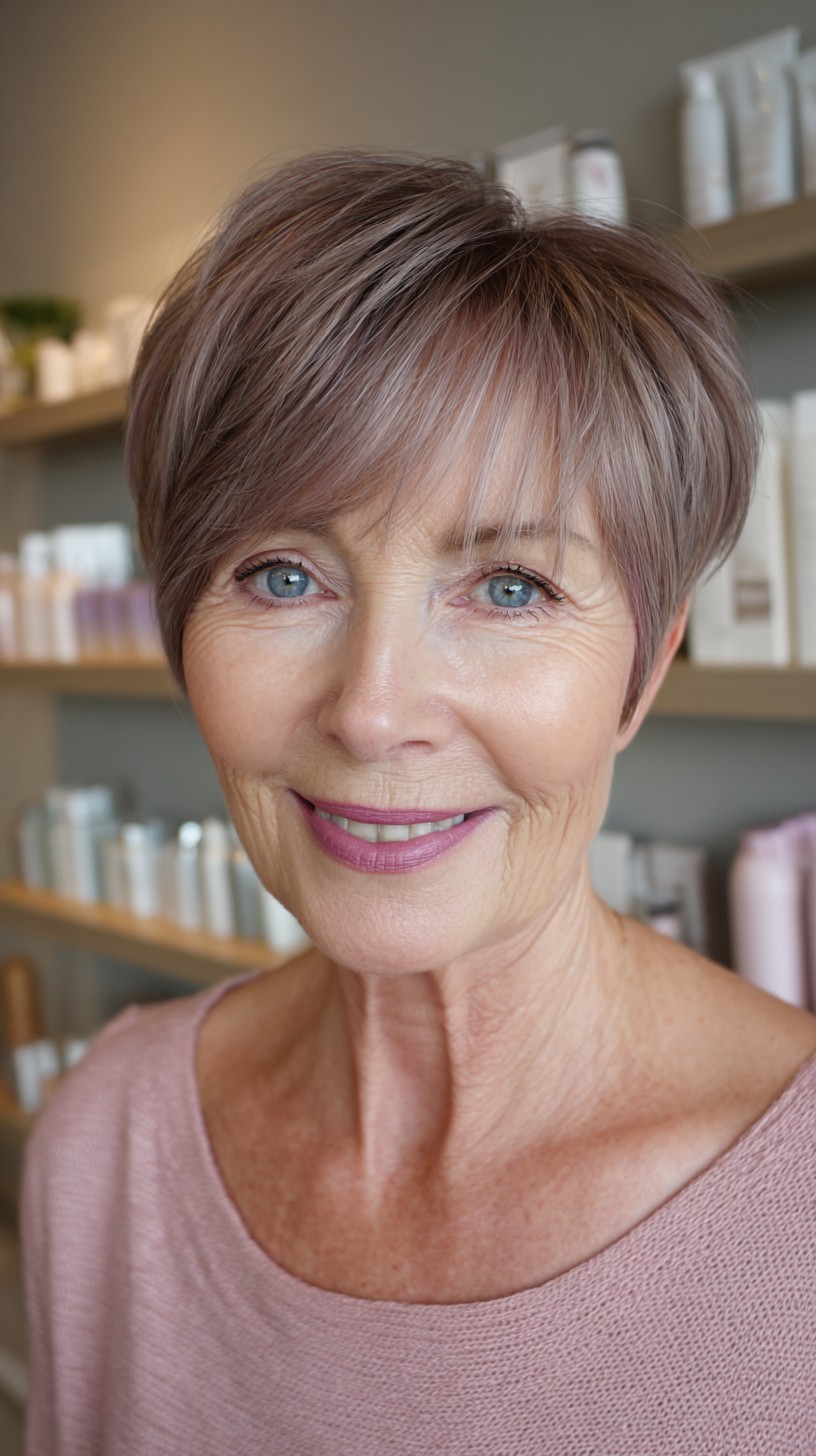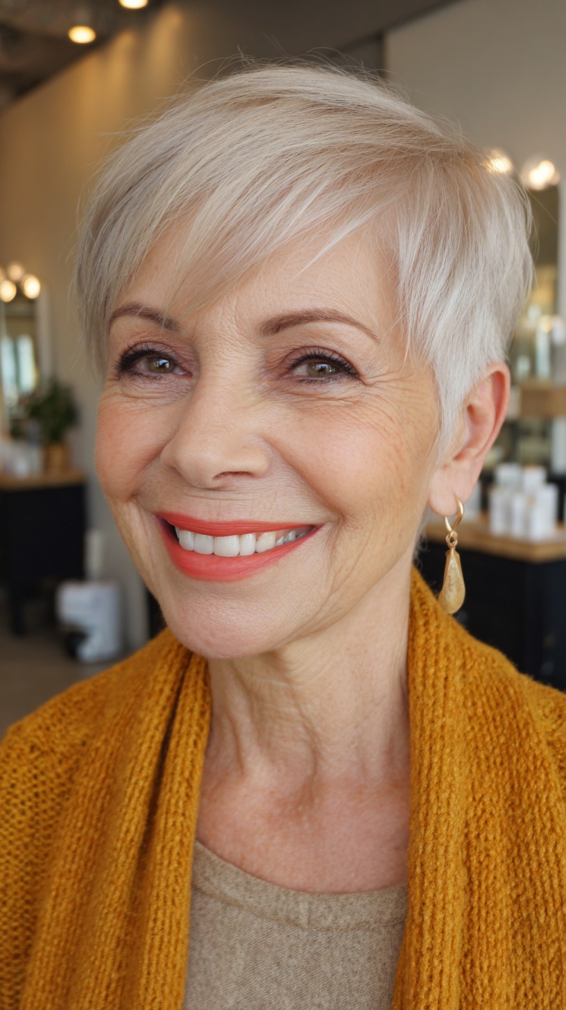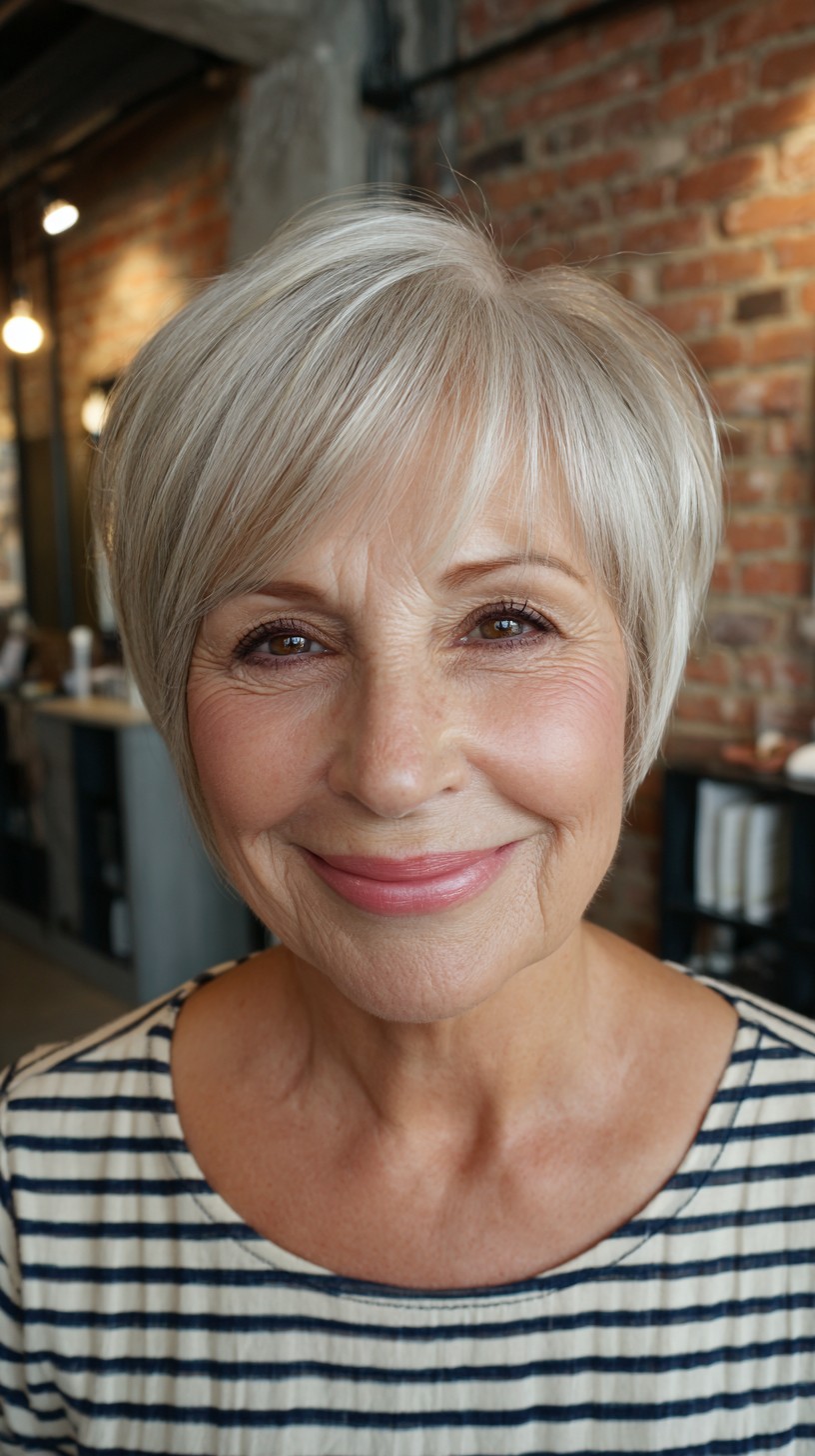 This elegant pixie cut features soft, textured layers that frame the face beautifully, making it perfect for mature women. The side bangs add a touch of flair while drawing attention to the eyes. This cut works wonderfully on fine to medium hair density and is ideal for those with oval or heart-shaped faces. However, keep in mind that shorter styles require regular upkeep to maintain the shape. The light, cool-toned color brings brightness, enhancing the overall look and complementing mature skin tones.